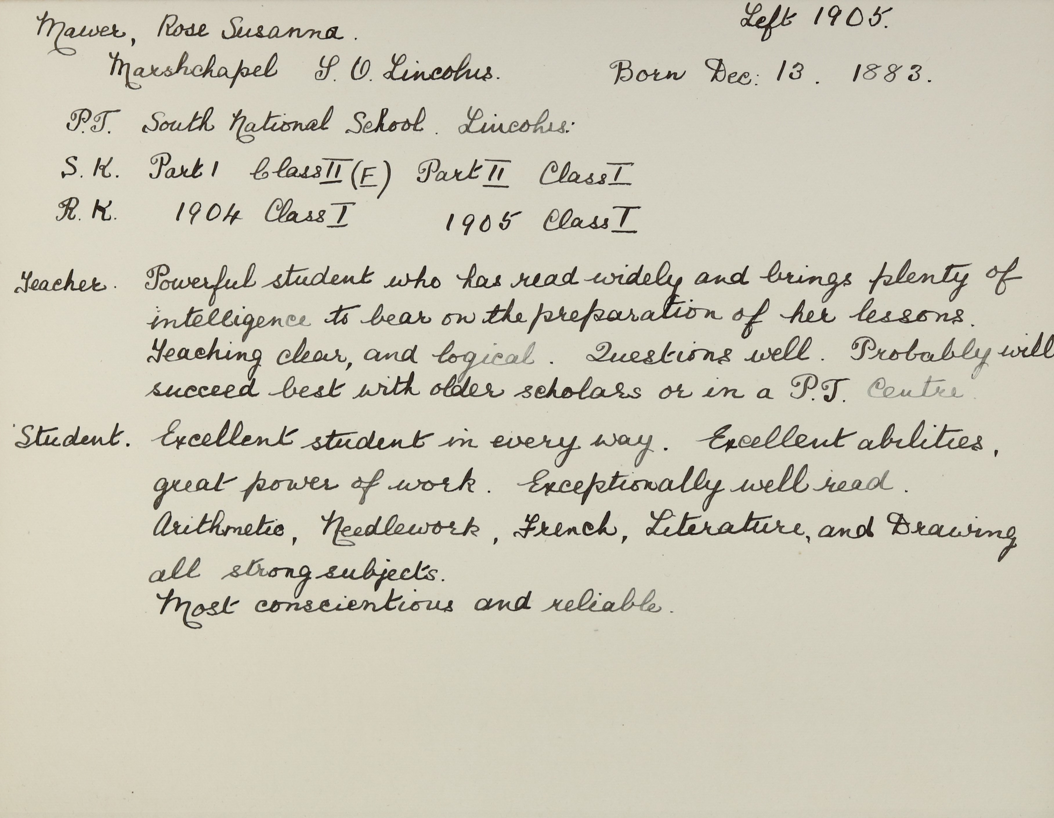 MAWER, Rose Susanna of 6 Brackenborough Road, Louth, Lincolnshire spinster died 04 August 1945. Probate Lincoln 31 October to Edith Alice Mawer, spinster. Effects £2438, 8s, 2d.