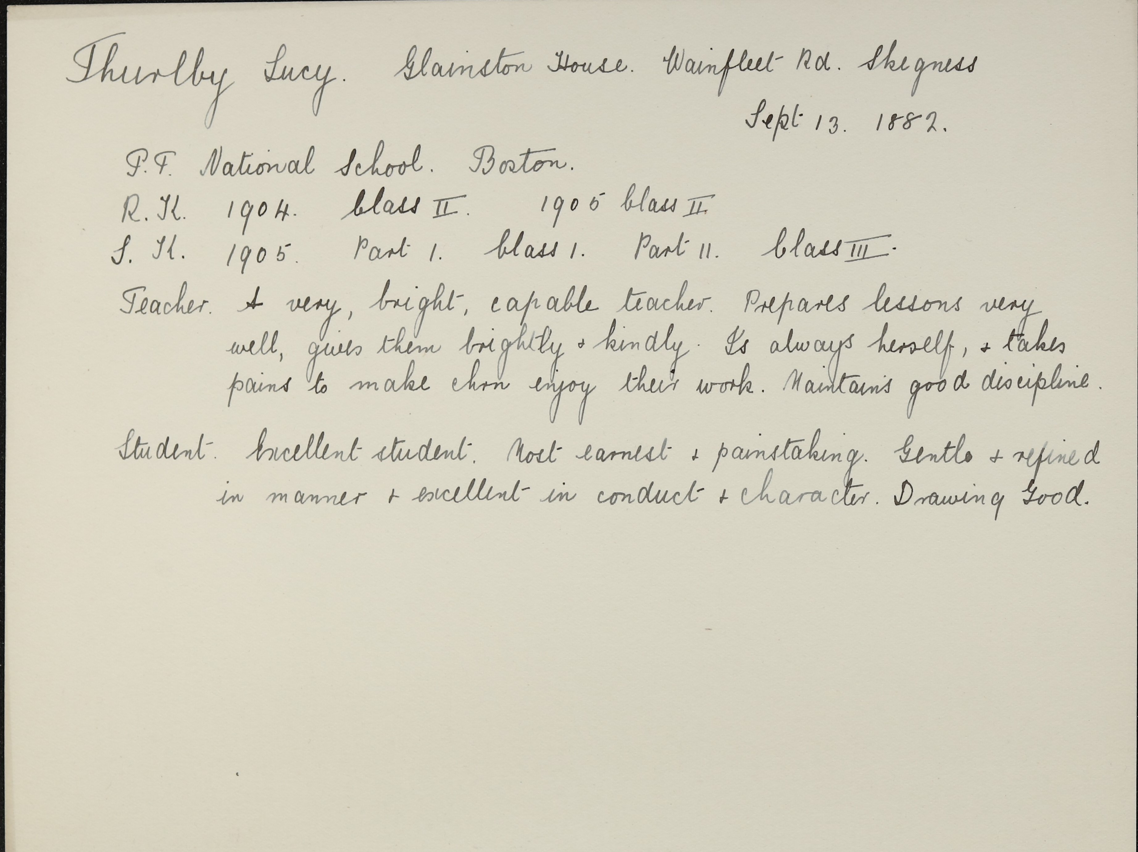 She is at North Side, Uppingham, Rutland as a visitor. Thomas Shelton (b. 1855) is listed as ‘Carpenter and Joiner’. His wife, Martha Shelton (b. 1855), is listed as ‘Certificated Teacher’. His mother and sister are listed as ‘Living On Own Means’. His children are unlisted. John R Thurlby and Lucy are unlisted visitors. There is a servant, Elizabeth Meadwell (b. 1877).