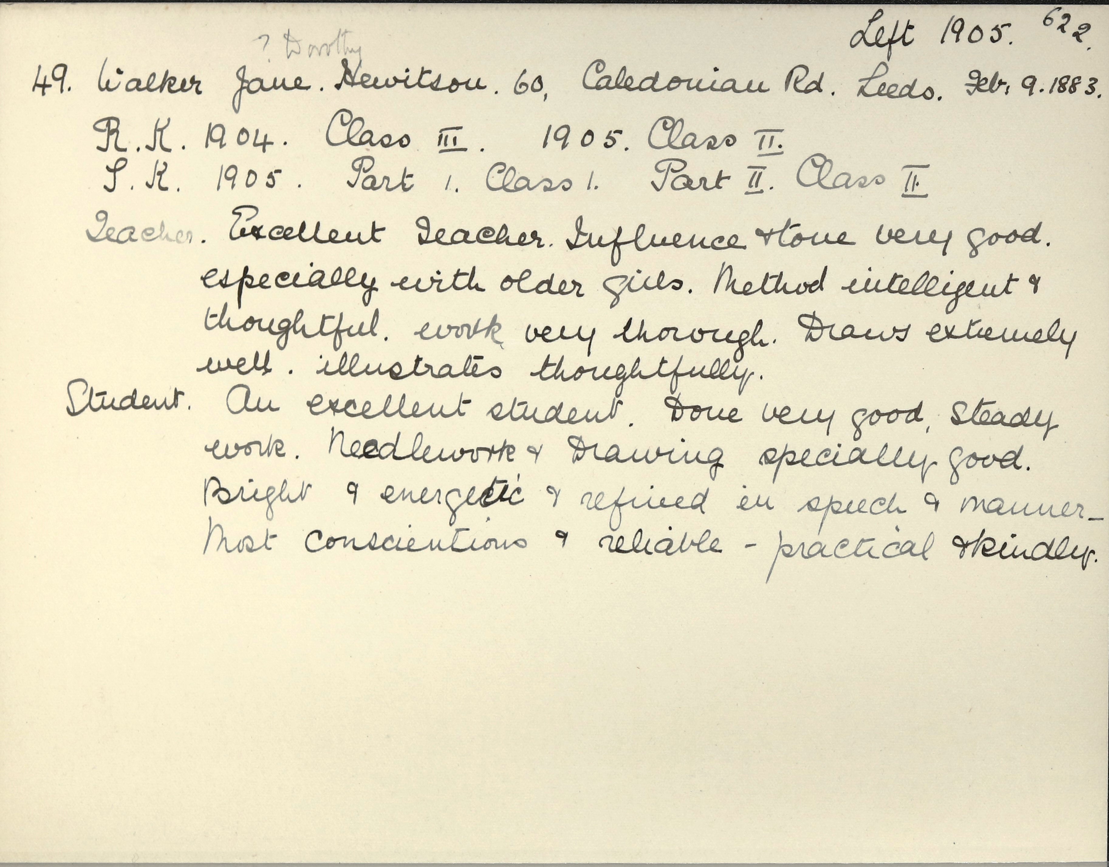 She is at 60 Caledonian Road, Leeds. Her father is listed as ‘Manager Cycle Shop’. Her mother and siblings (Nelly, Willie, Christopher and George) are unlisted. Her brother, Tom, is listed as ‘Mechanical Engineer. There is a visitor, Margaret Huntson (b. 1878). Dorothy is listed as ‘School Teacher’.