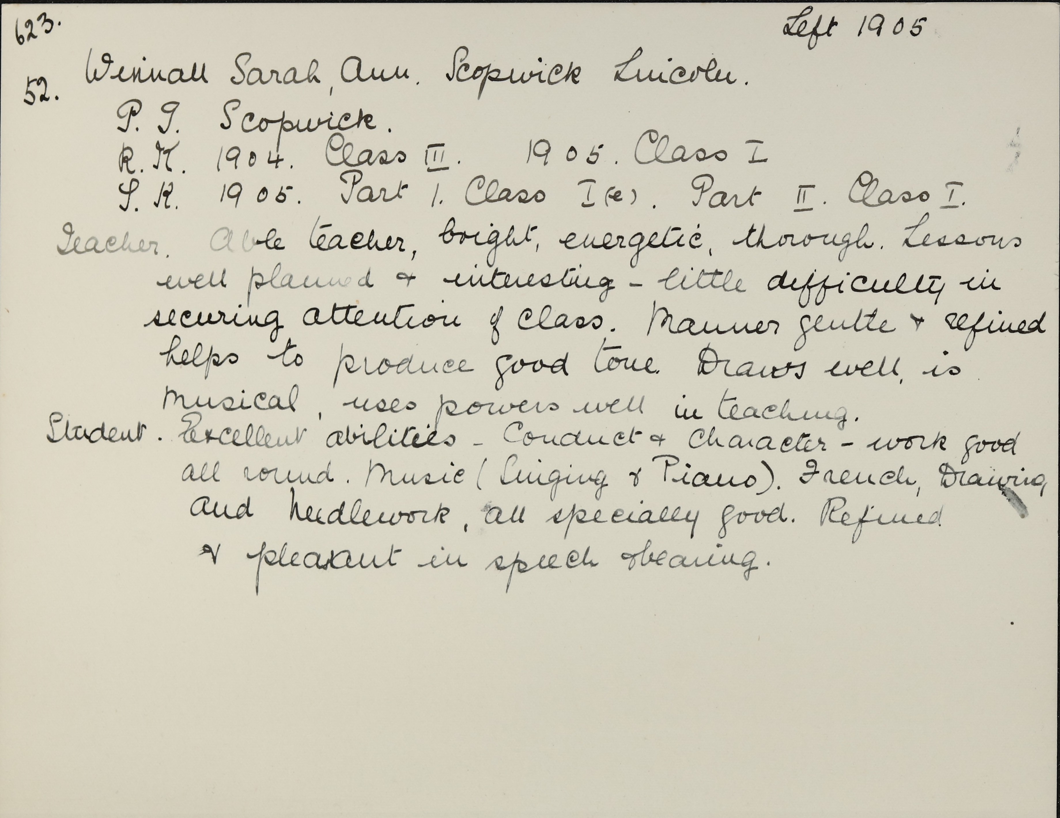 She is 149 West End, Derbyshire. Her father is listed as ‘Schoolmaster’. Sarah, her mother and siblings (William, John, Harry, Arthur and Minnie) are unlisted.