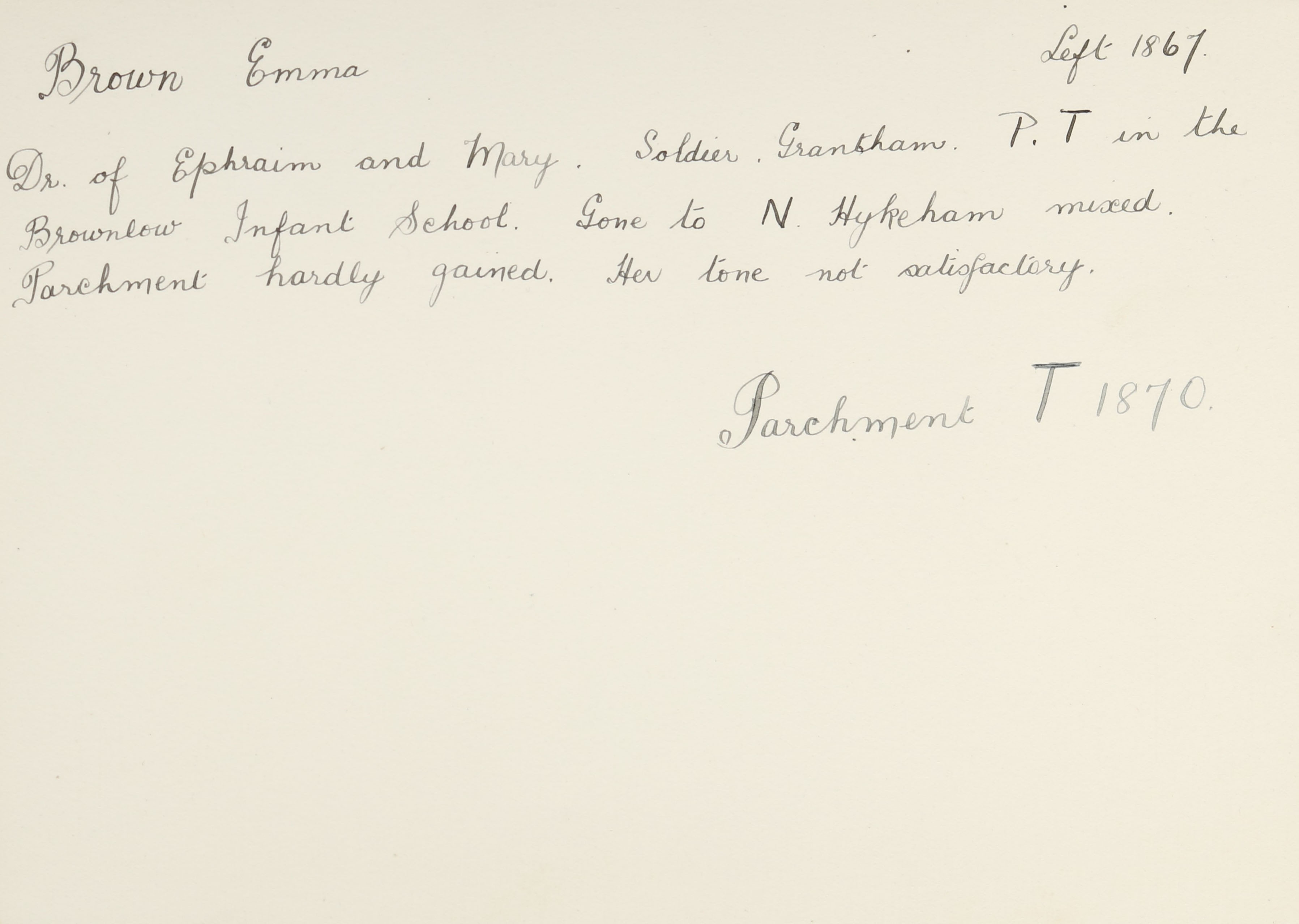 She is at Bridgend Road, Grantham. Her father is listed as ‘Pensioner’. Emma and her sister, Elizabeth, are listed as ‘Pupil Teacher’. Her mother and siblings, Mary and John, are unlisted.