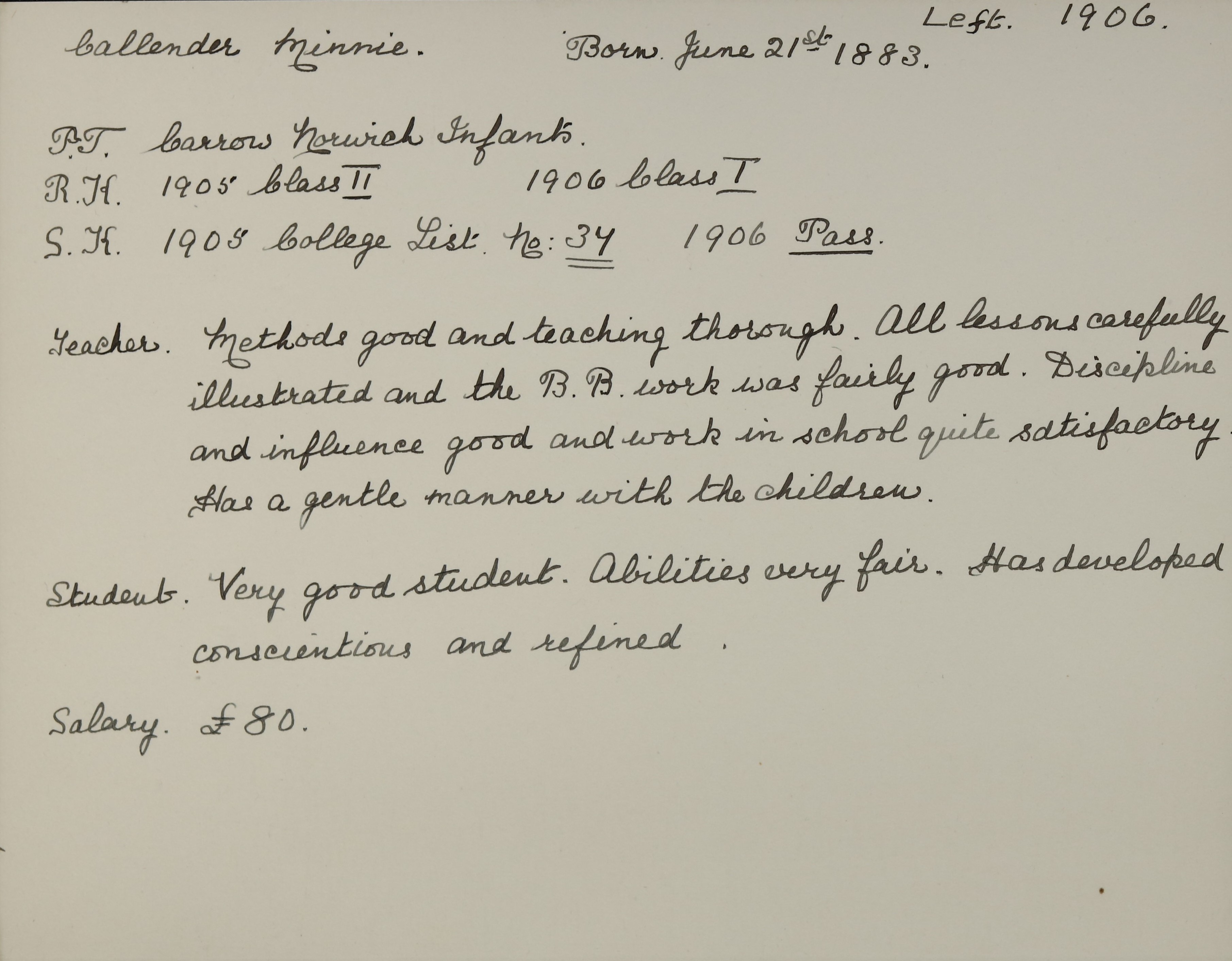She is at Burnham Westgate, King’s Lynn, Norfolk. Minnie is listed as ‘Head teacher County Council’. Evelyn Sidney (b. 1887) is listed as ‘Assistant Teacher County Council’.