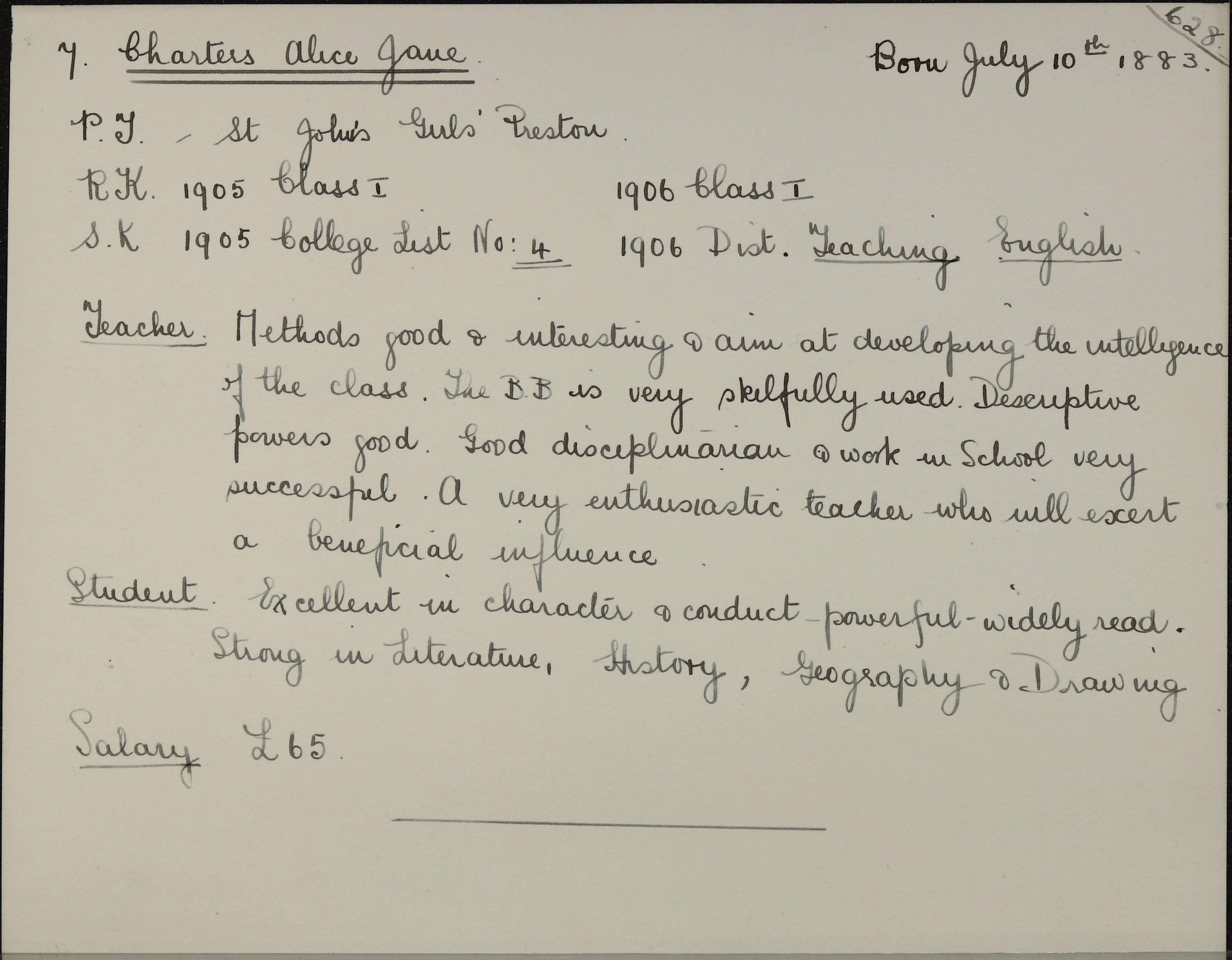 Appointed to St. Mary's School, Preston. £65.