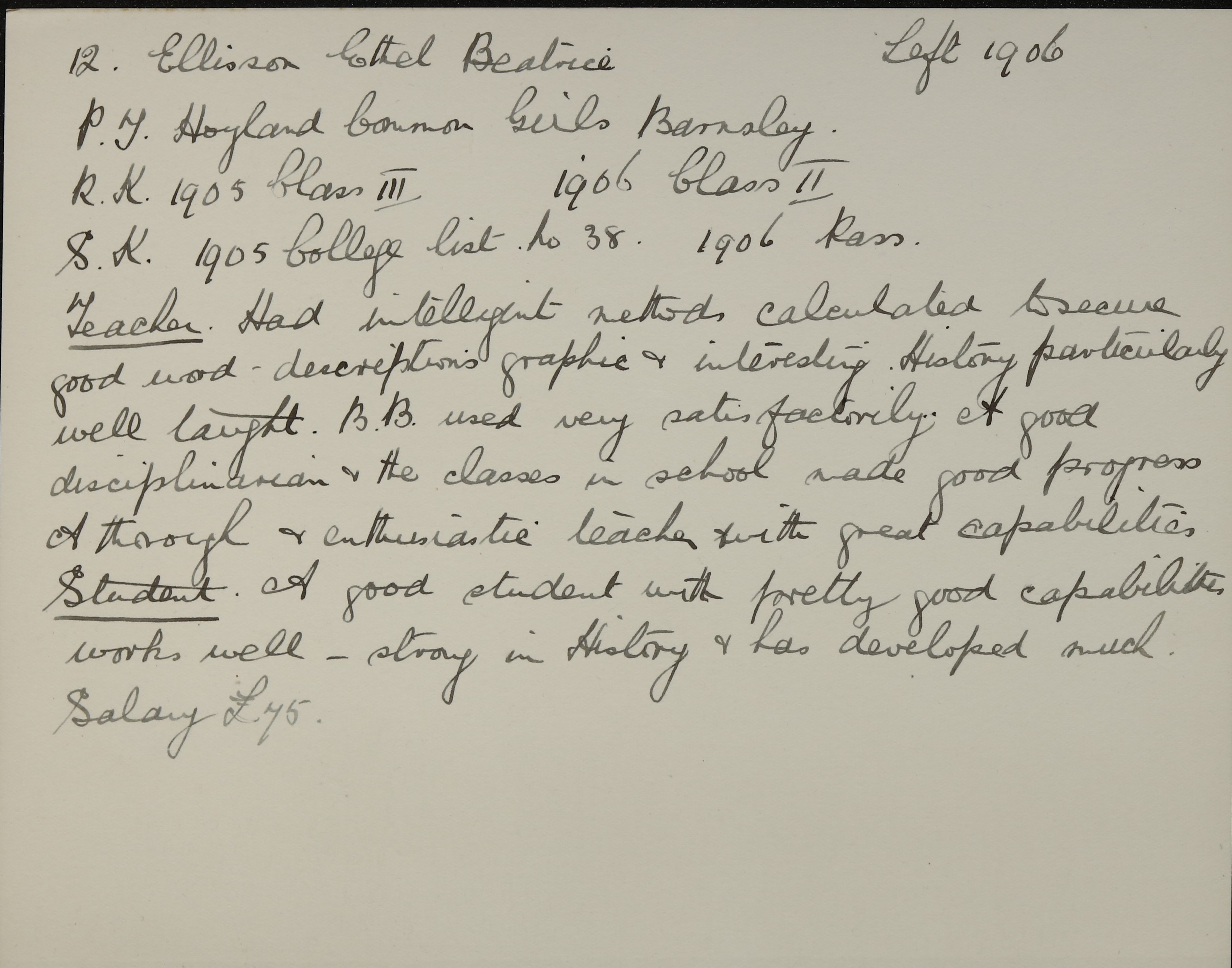 She is at 12 Hoyland Road, Hoyland. Her father is listed as ‘Chemist and Druggist’. Her brother, Arthur, is listed as ‘Chemist’s Assistant’. Her brother, Alfred, is listed as ‘Colliery Clerk’. Ethel, her mother and siblings (Eliza, Mary, Eleanor, Mildred, Constance and Hannah) are unlisted.
