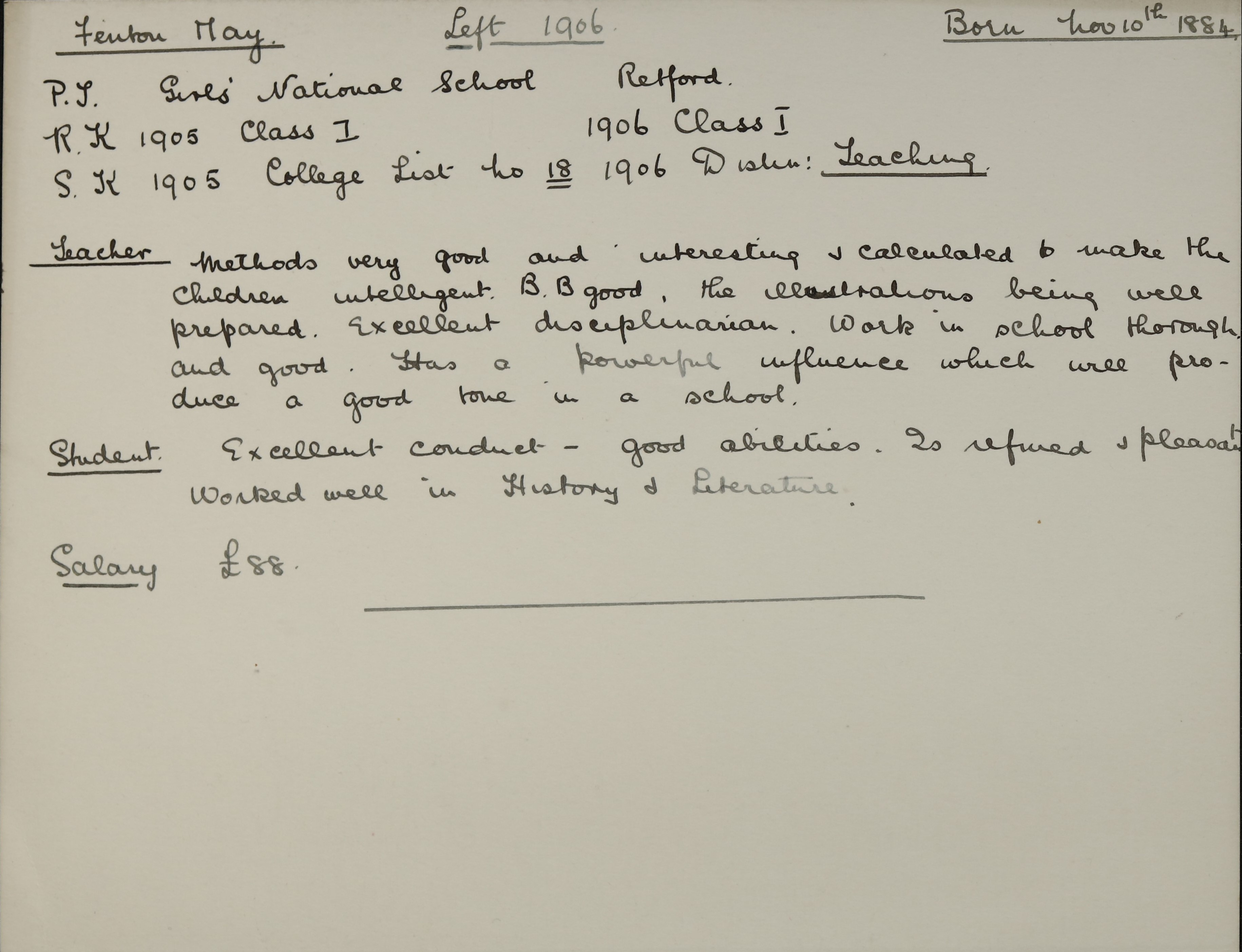 She is at 62 Sellons Avenue, Harlesden as a boarder. The head of the household, George Henry Knowles (b. 1874), is listed as ‘Private Esq of Derby’. His wife, Aline Eugenie Knowles (b. 1863), daughter, Aline Mary Knowles (b. 1904), and a visitor, Eugenie Water (b. 1862), are unlisted. May is listed as ‘Certificated Teacher Trained’.