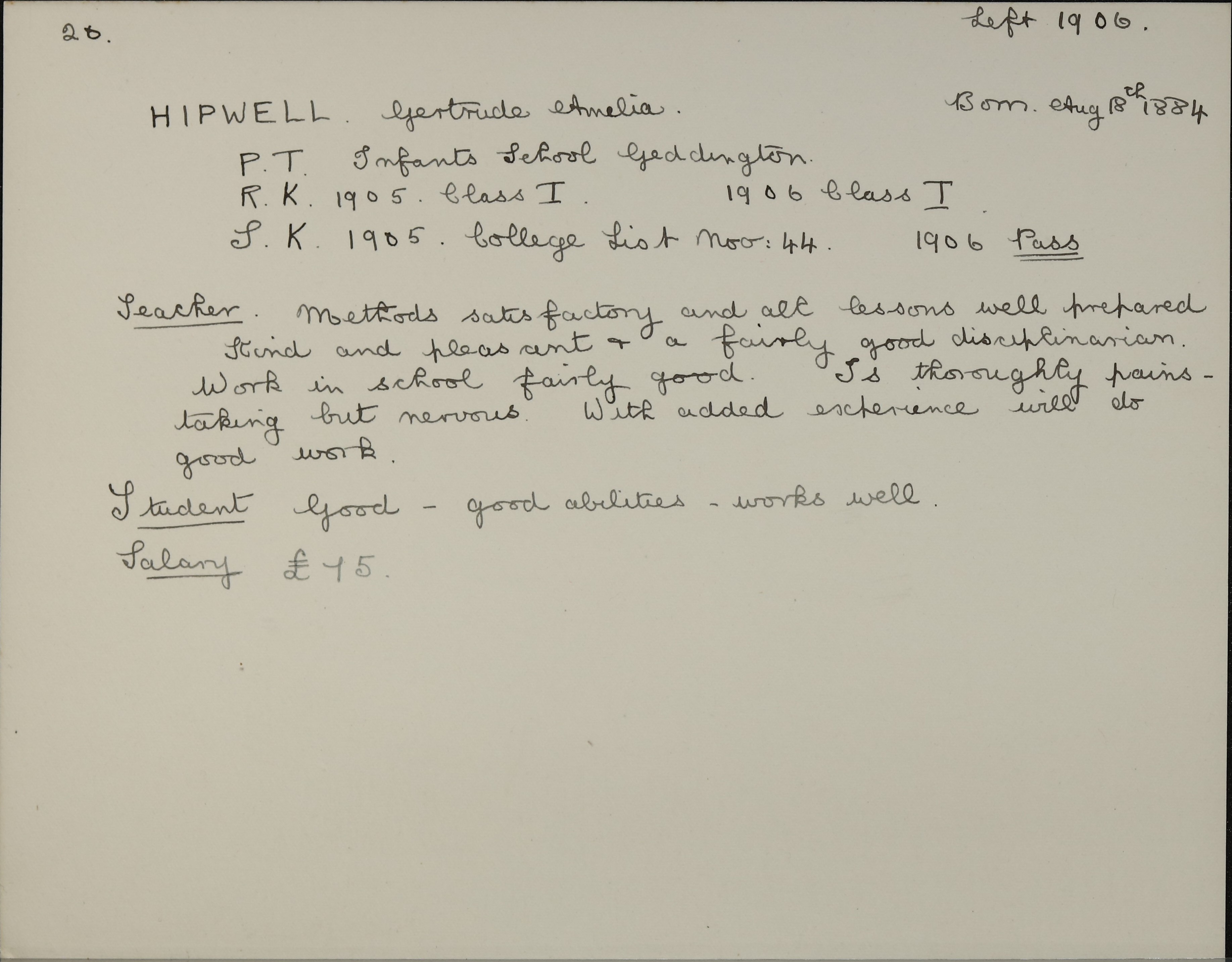 HIPWELL, Gertrude Amelia of 4 Hampden Road, Malvern Link, Worcestershire, spinster died 12 January 1958. Probate London 1 May to William Lambert Hipwell, printer and Ralph Norton Hipwell, railway clerk. Effects £1906, 6s, 2d.