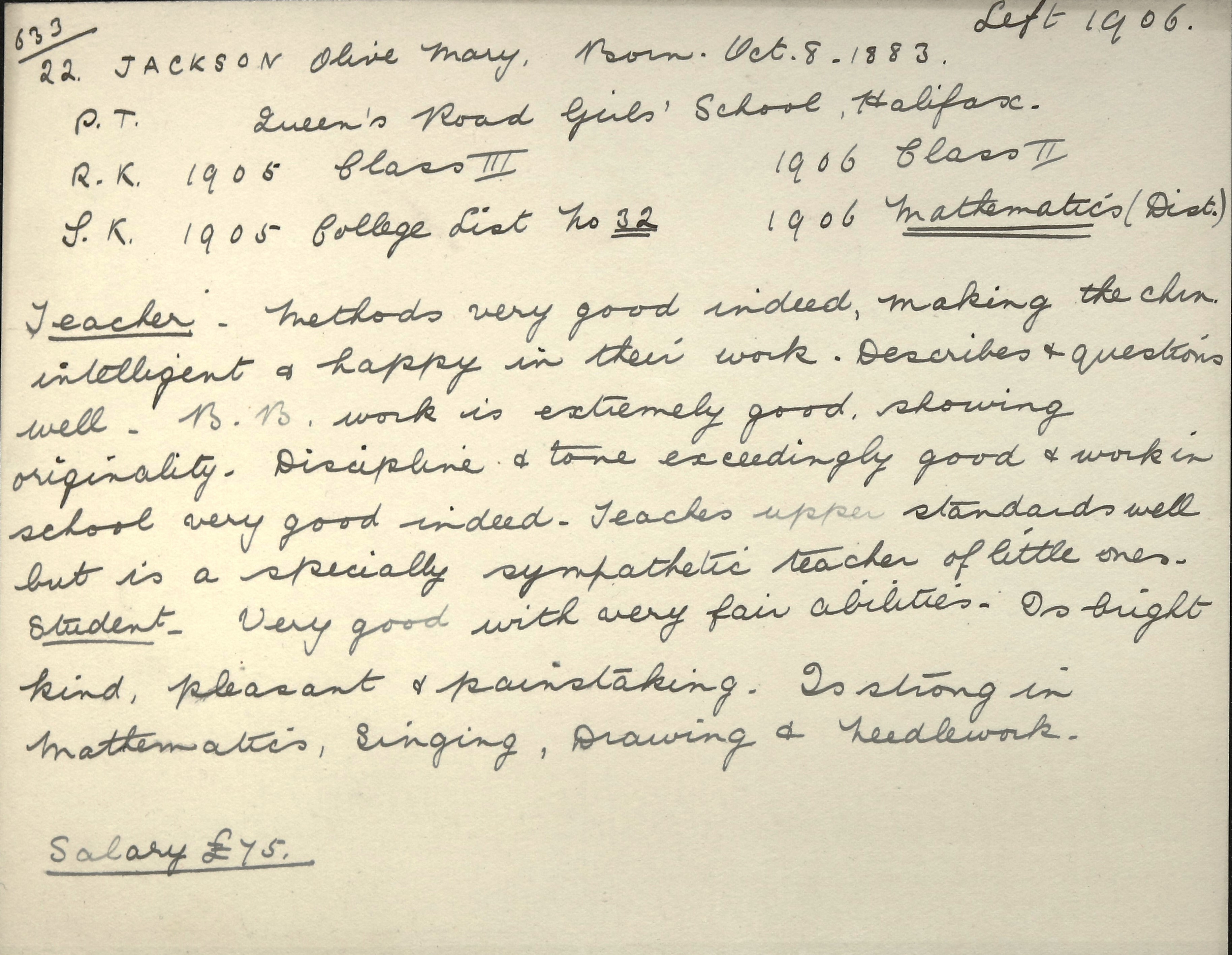 She is at 61 Savile Park Street, Halifax. Her mother is listed as widow and ‘Living on Own Means’. Her brother, Harvey, is listed as ‘Machine Maker’s Draughtsman’. Olive and her sister, Jessie, are listed as ‘Pupil Teacher’. Her sisters, Maude and Rosa, are unlisted.