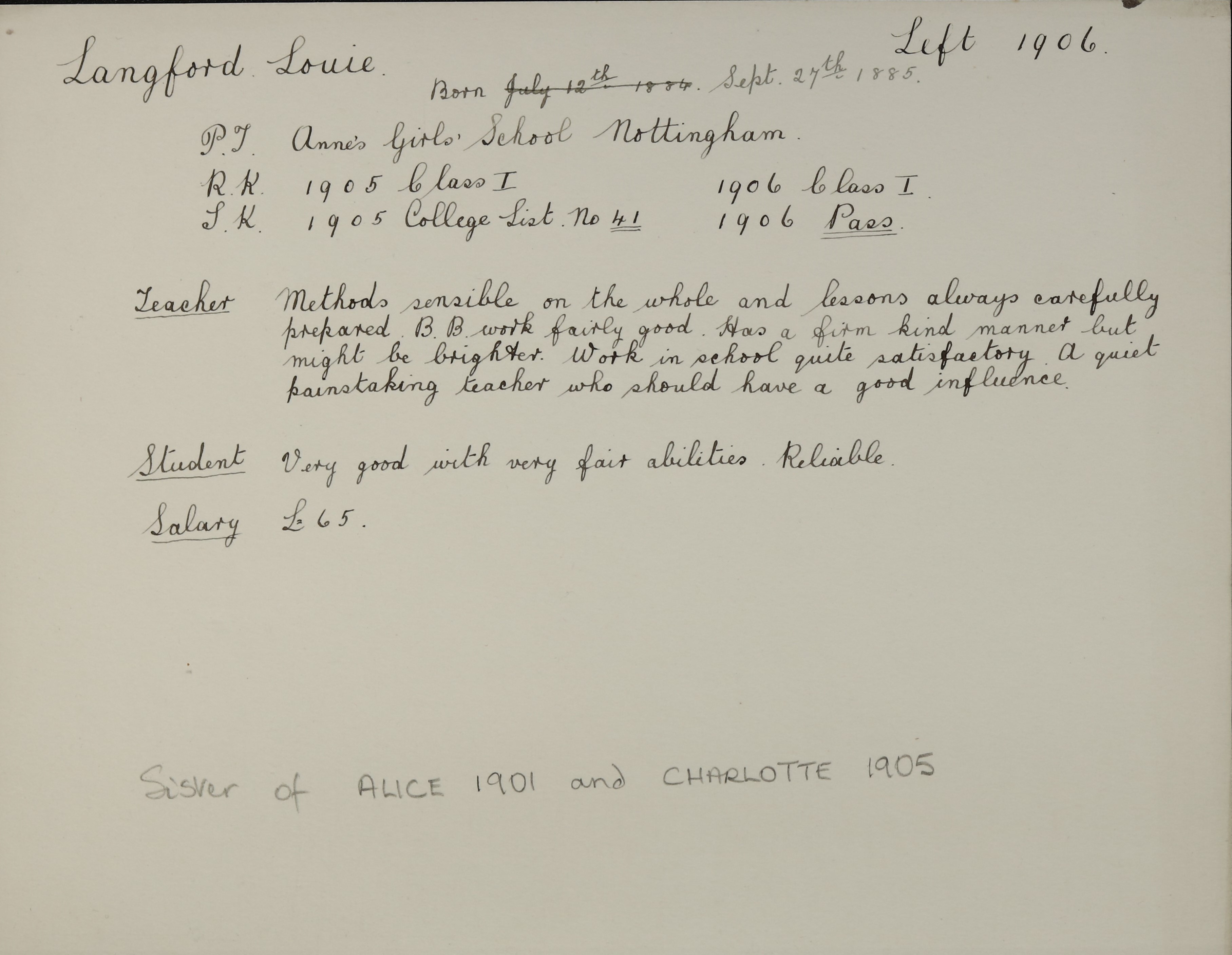 She is at 10 Robin Hoods Chase, Nottingham. Her father is listed as ‘Retired Captain Late Inspector Army Schools’. Her mother is unlisted. Her sister, Alice, is listed as ‘Student Pupil Teacher’. Her sister, Helena, is listed as ‘Drapers Assistant’. Her sister, Charlotte, is listed as ‘Pupil Teacher (Church)’. Louie and her brothers, Arthur and Gordon, are unlisted. There is a servant, Alice Wrag (b. 1875).