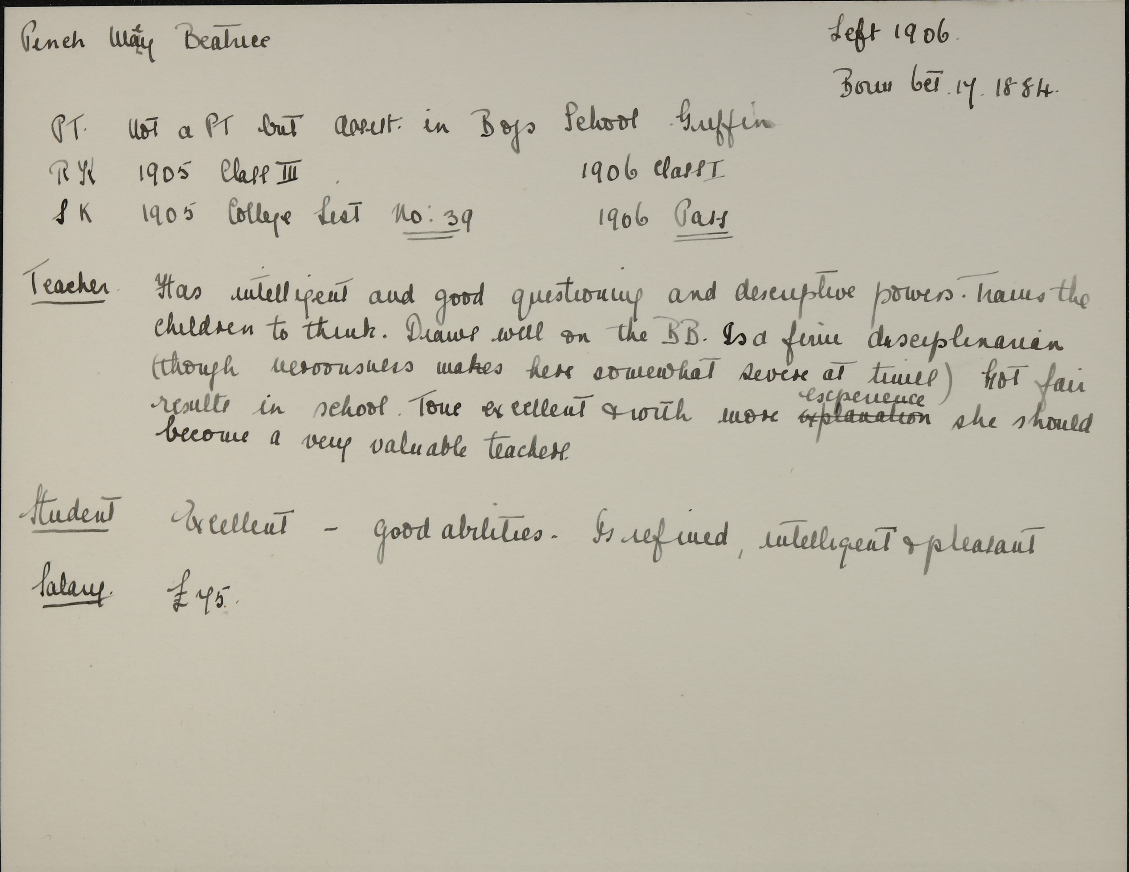 She is at Vicarage, Rutland Street, Blackburn. Her father is listed as ‘Clergyman Established Church’. Her mother and sisters, Alice and Edith, are unlisted. Her sister, Annie, is listed as ‘Cookery Mistress’. Mary is listed as ‘Head Teacher’. There is a servant, Ellen Gavin (b. 1890).