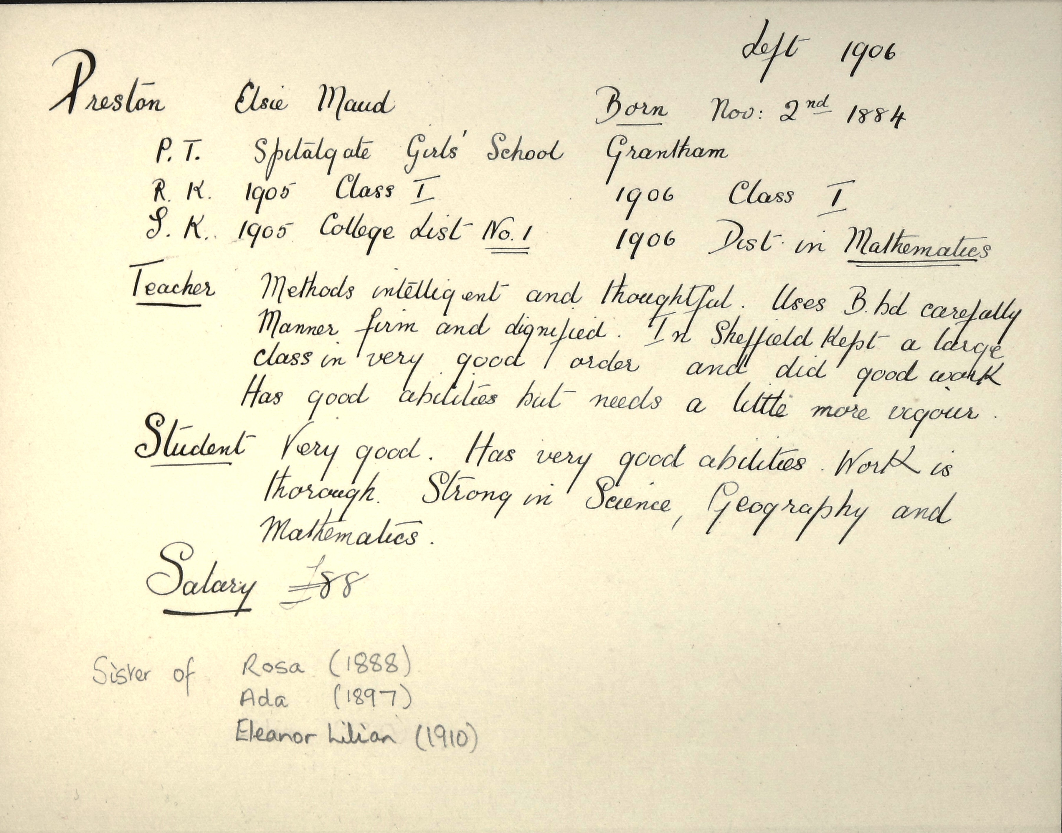 Sisters: Ethel May Preston (b. 1873), Rosa Emma Preston (b. 1868) [LDTC 1888], Ada Annie Preston (b. 1875) [LDTC 1897], Florence Alice Preston (b. 1878), Mabel Preston (b. 1880), Marian Speat Preston (b. 1882), Olive Lilian Eleanor Preston (b. 1889) [LDTC 1910], Kathleen Kennerley Preston (b. 1891)
