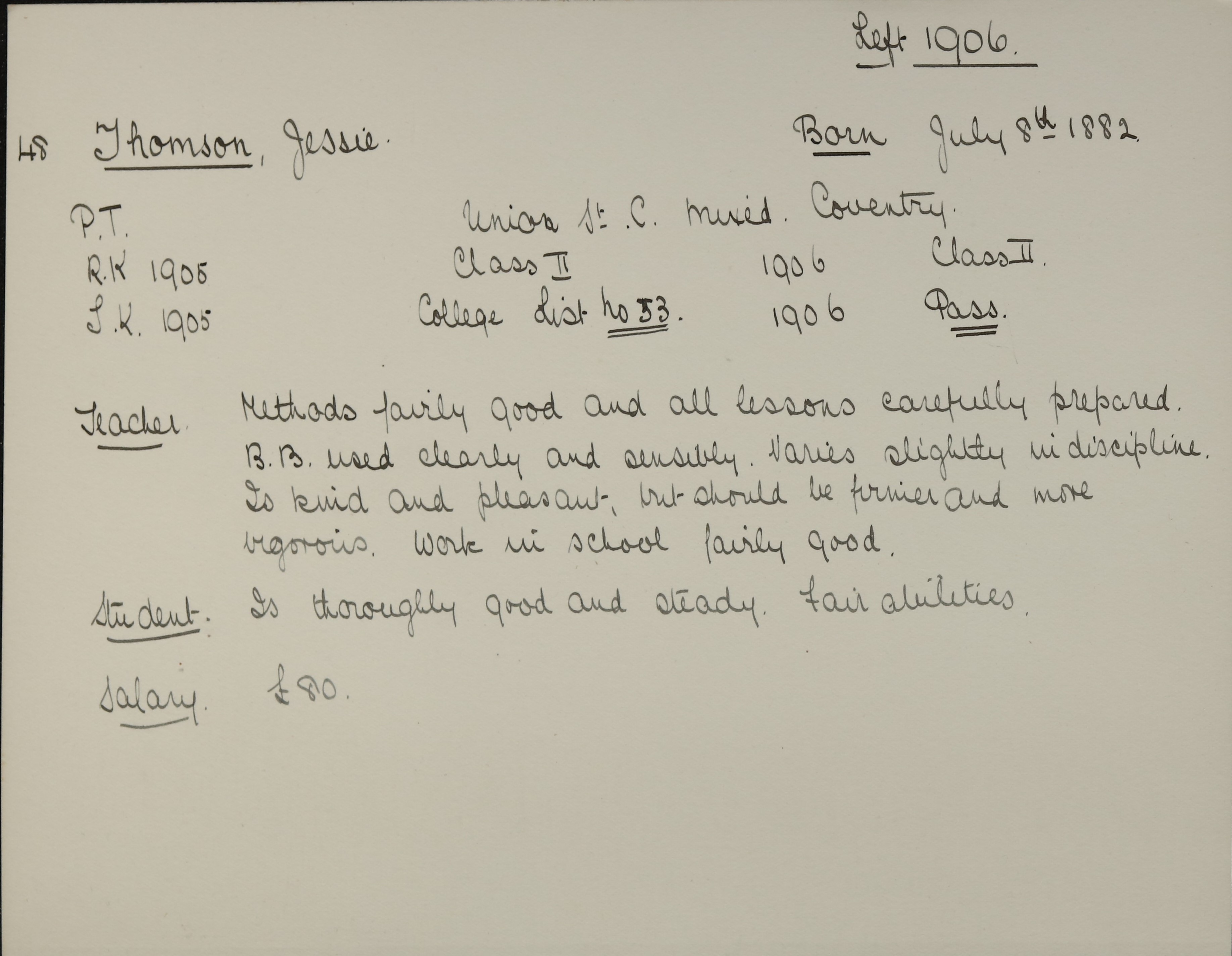 137 Much Park Street, Coventry. Her uncle, John Thomson (b. 1852), is listed as ‘Veterinary Surgeon’. Her aunt, May Thomson (b. 1849), is unlisted. Jessie is listed as ‘Pupil Teacher’. Her cousin, Archibals W Fraser (b. 1879), is listed as ‘Sanitary Inspector’. There is a servant, Ethel Woods (b. 1884).