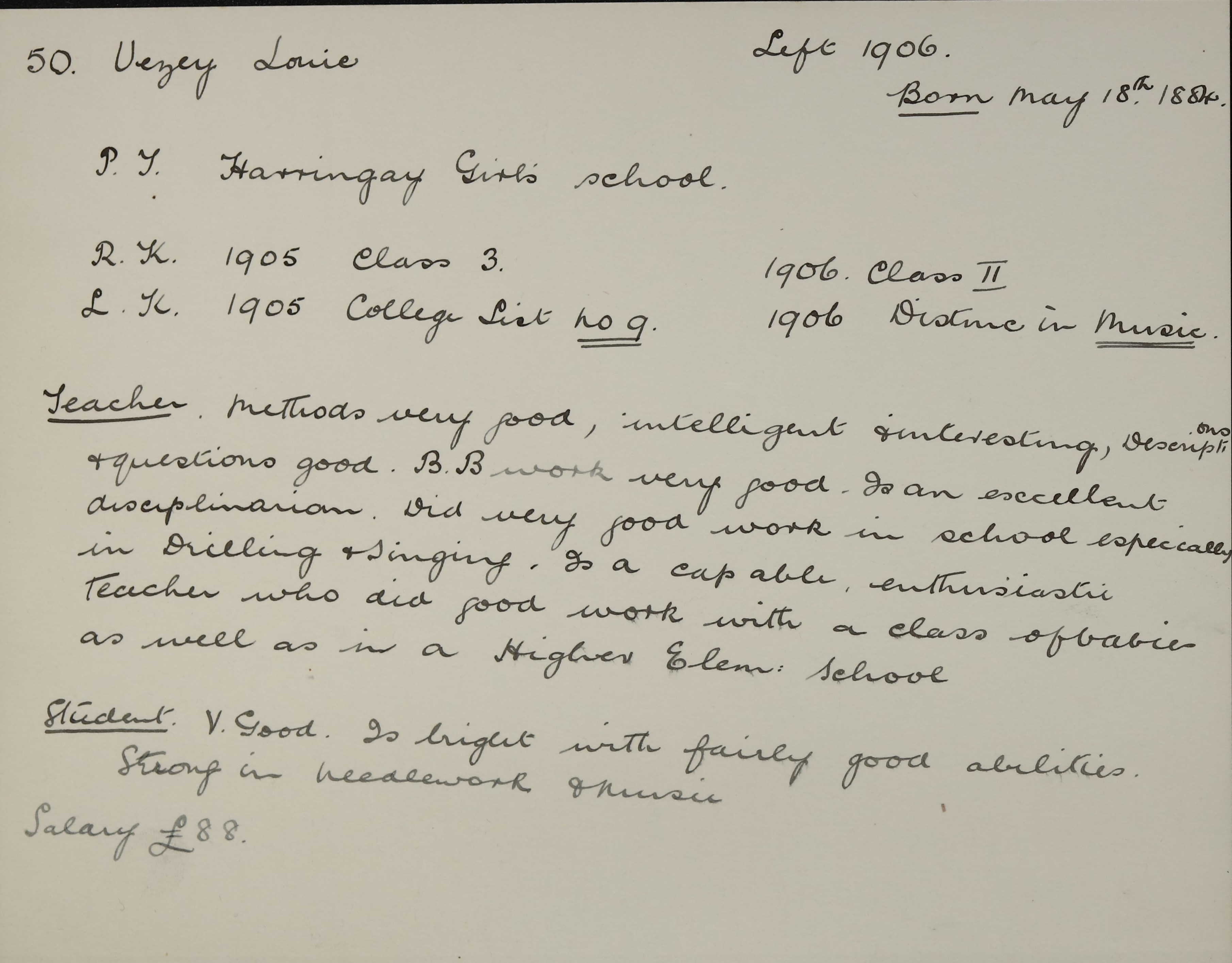 She is at 78 Hewitt Road, Hornsey. Her father is listed as ‘Solicitor’. Her mother is unlisted. Louie is listed as ‘School Teacher’. There is a servant, Susan J Potterill (b. 1883).