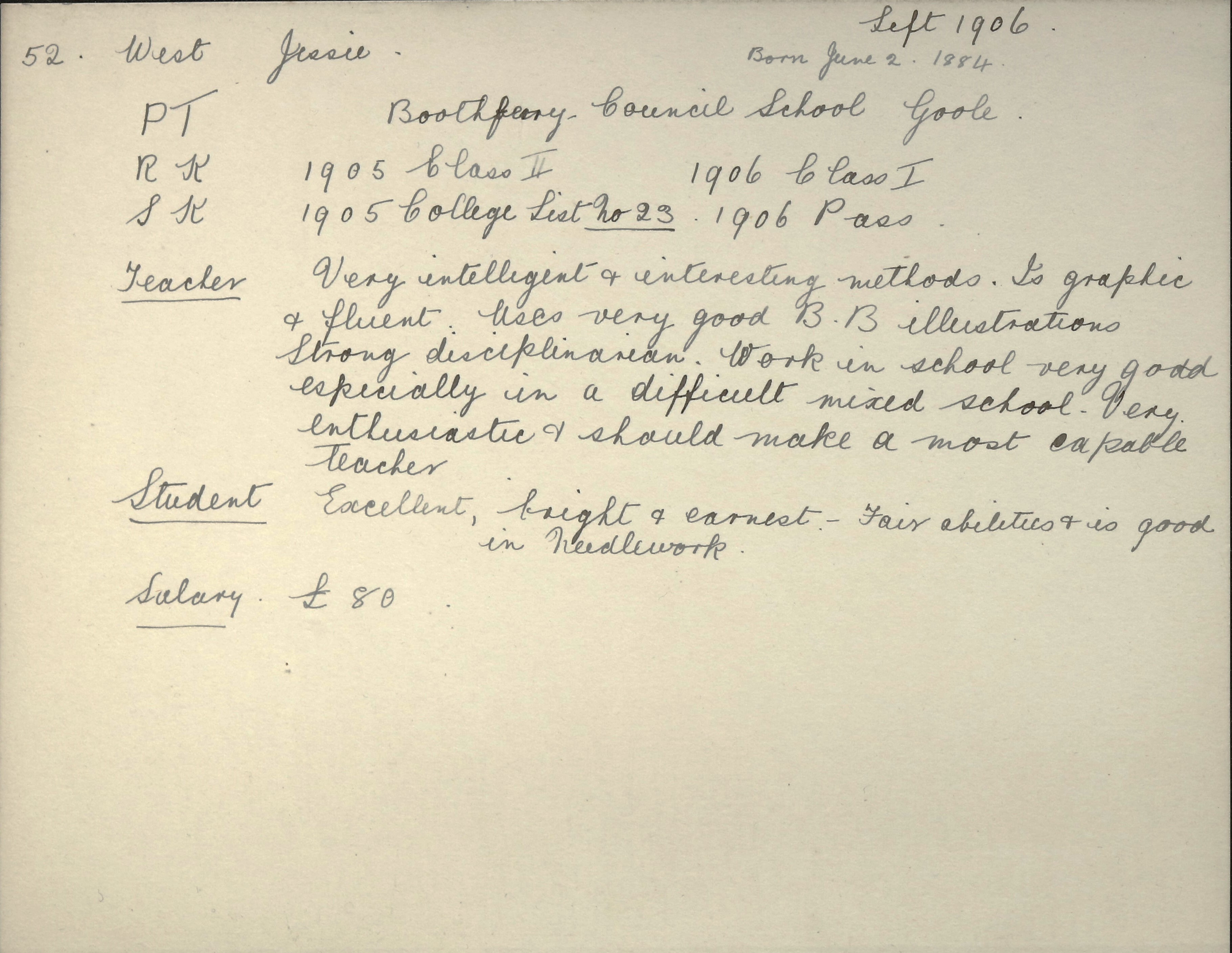 She is at 16 Marshfield, Goole. Her father is listed as ‘Clerk in Shipping’. Jessie is listed as ‘Pupil Teacher’. Her mother and sisters, Louie, Gladys and Borge, are unlisted.