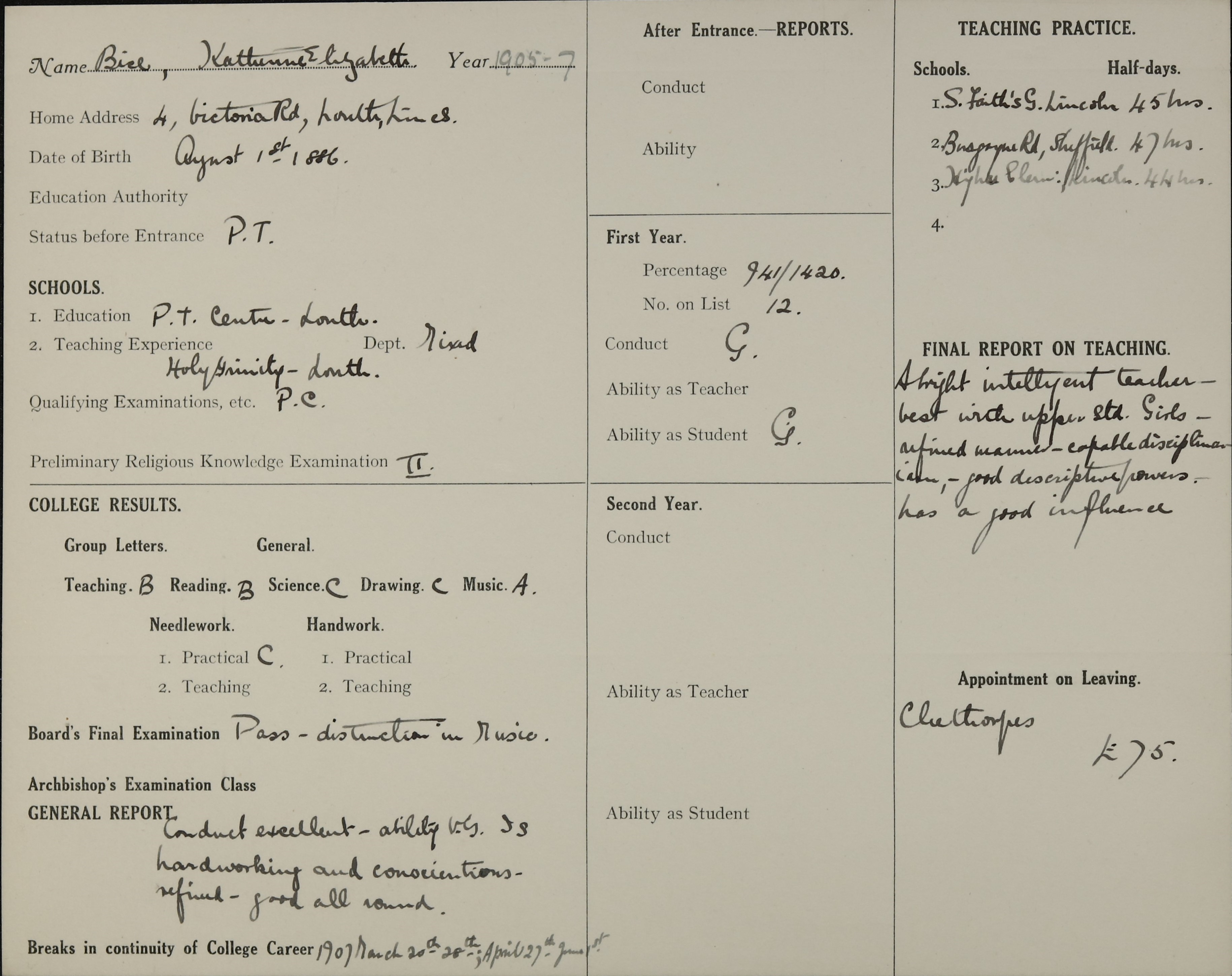 She is at 4 Victoria Road, Louth. Her father is listed as ‘Schoolmaster’. Katherine and her mother are unlisted.