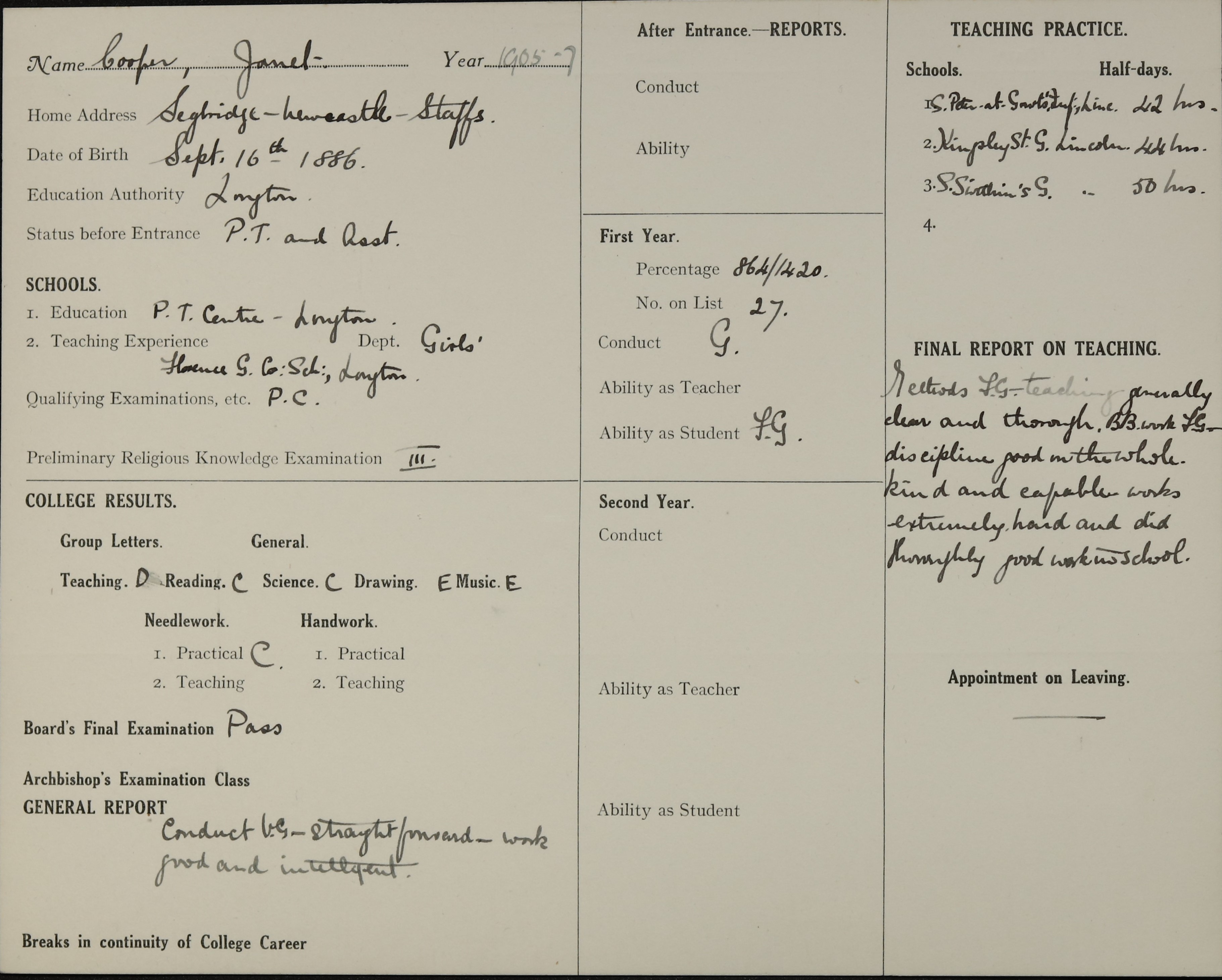 Born: 16 September 1886, Stoke on Trent