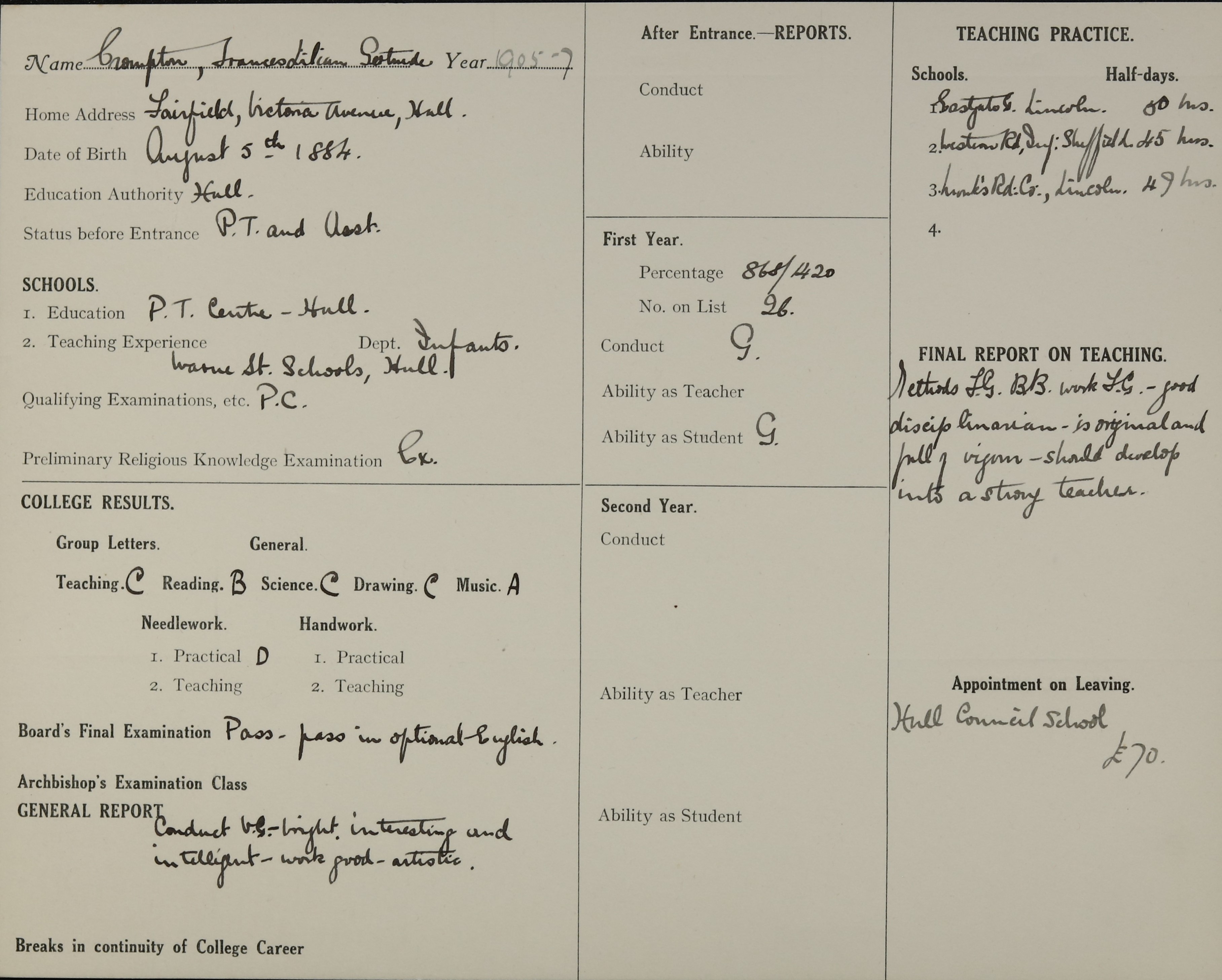 Appointed to Hull Council School. £70.