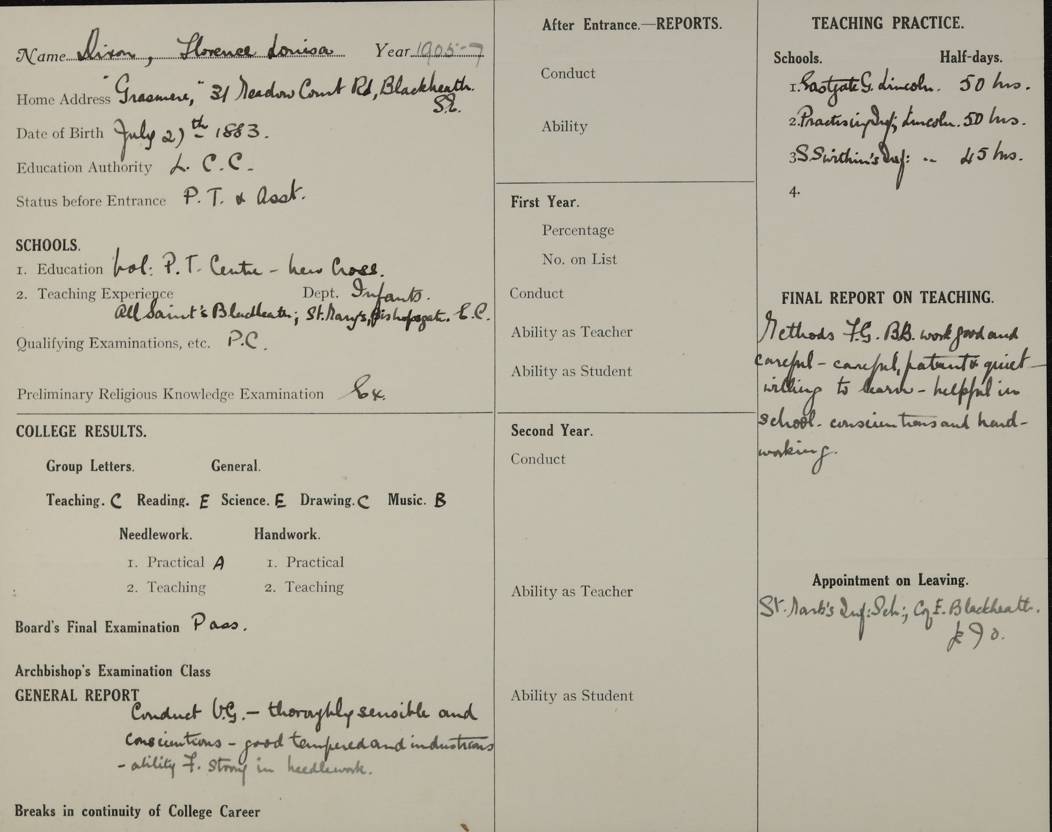 She is at 7 Lee Park, Lewisham. Her father is listed as ‘Gardener’. Florence and her sisters, Rosaline and Mabel, are listed as ‘Elementary School Teacher’. Her sister, Emma, is unlisted.