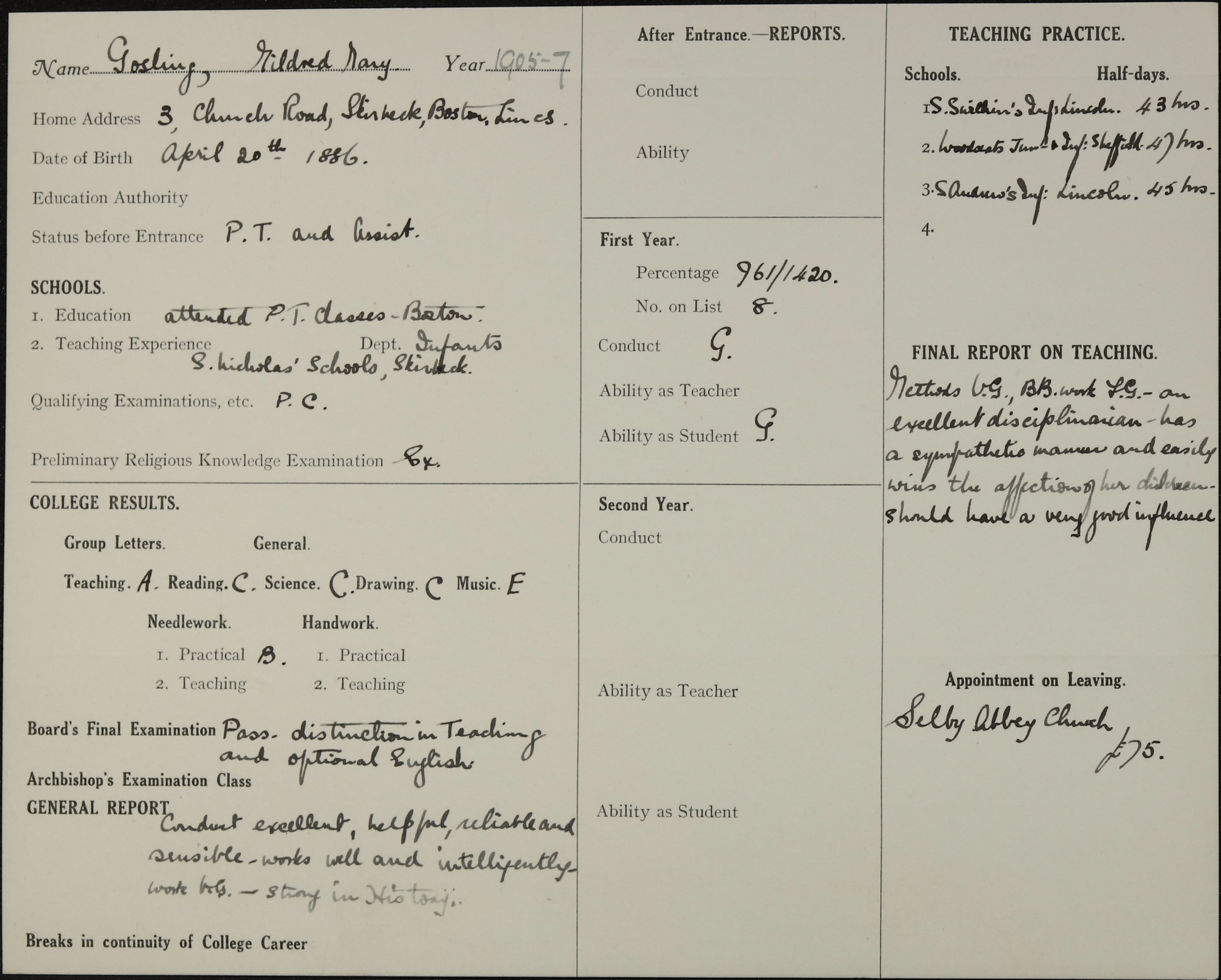 She is at Church Roas, Skirbeck, Boston, Lincolnshire. Her grandmother, Sarah Gosling, is listed as a widow and ‘Living on Own Means’. Her mother is unlisted. Mildred is listed as ‘Monitress in a School’.