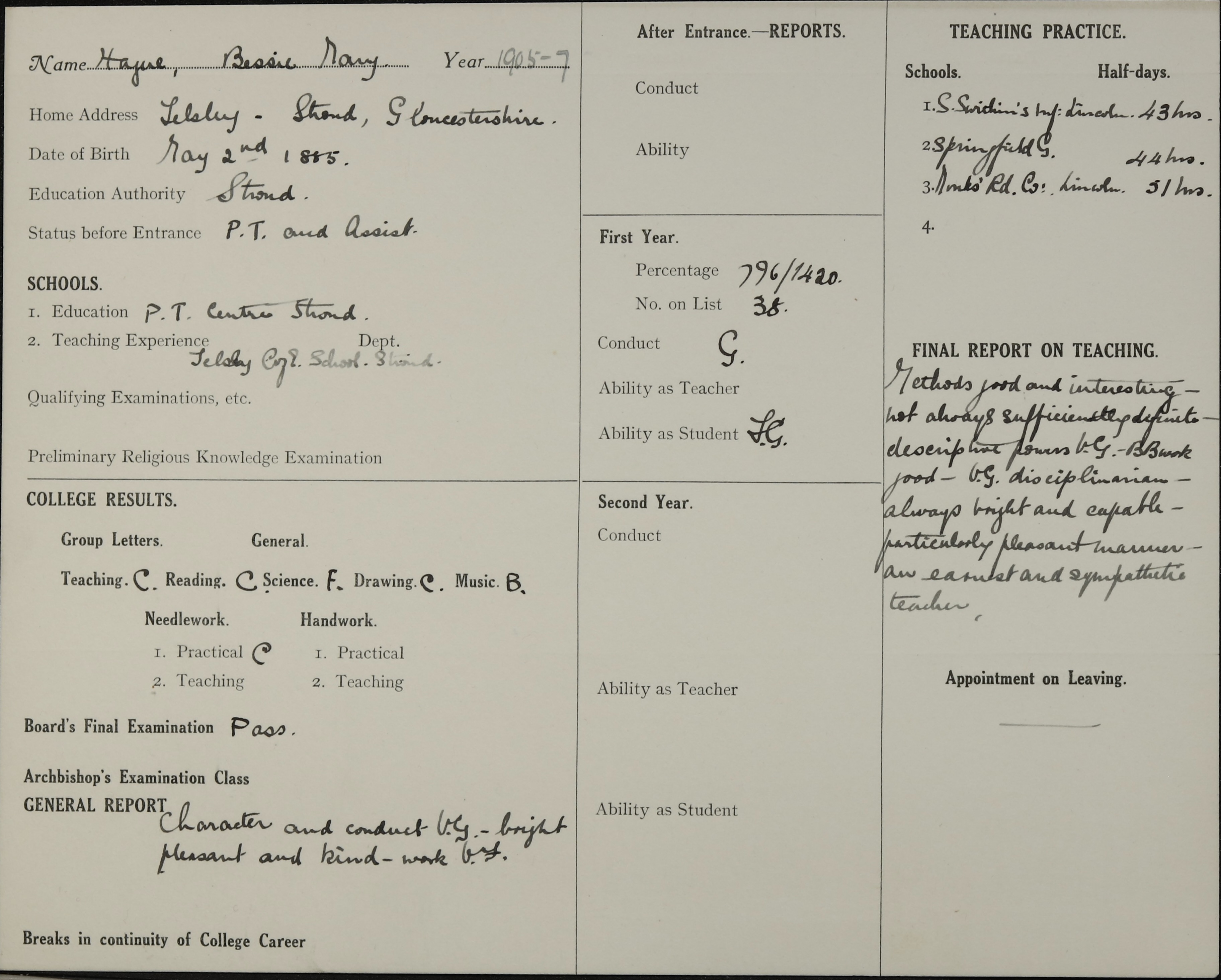 She is at Pooles Lane, Kings Stanley, Stroud. Her father is listed as ‘Engine and Machine Maker, Turner Fitter and Sub Post Master’. Her mother is listed as ‘Sub Postmaster Assistant’. Her brother, Henry, is listed as ‘Blacksmiths Apprentice’. Her sister, Florence, is listed as ‘Pupil Teacher’. Bessie and her brother, George, are unlisted.