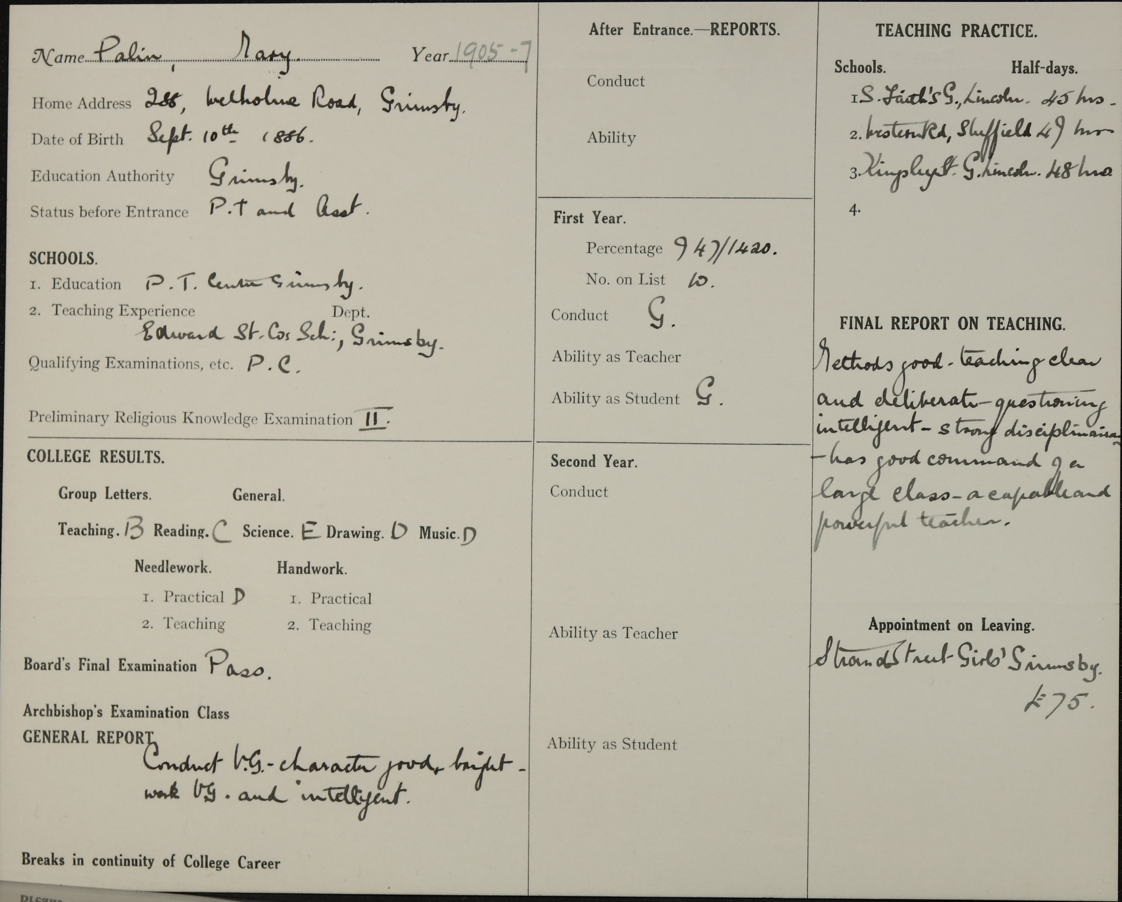Appointed to Strand St. Girls’ School, Grimsby. £75.