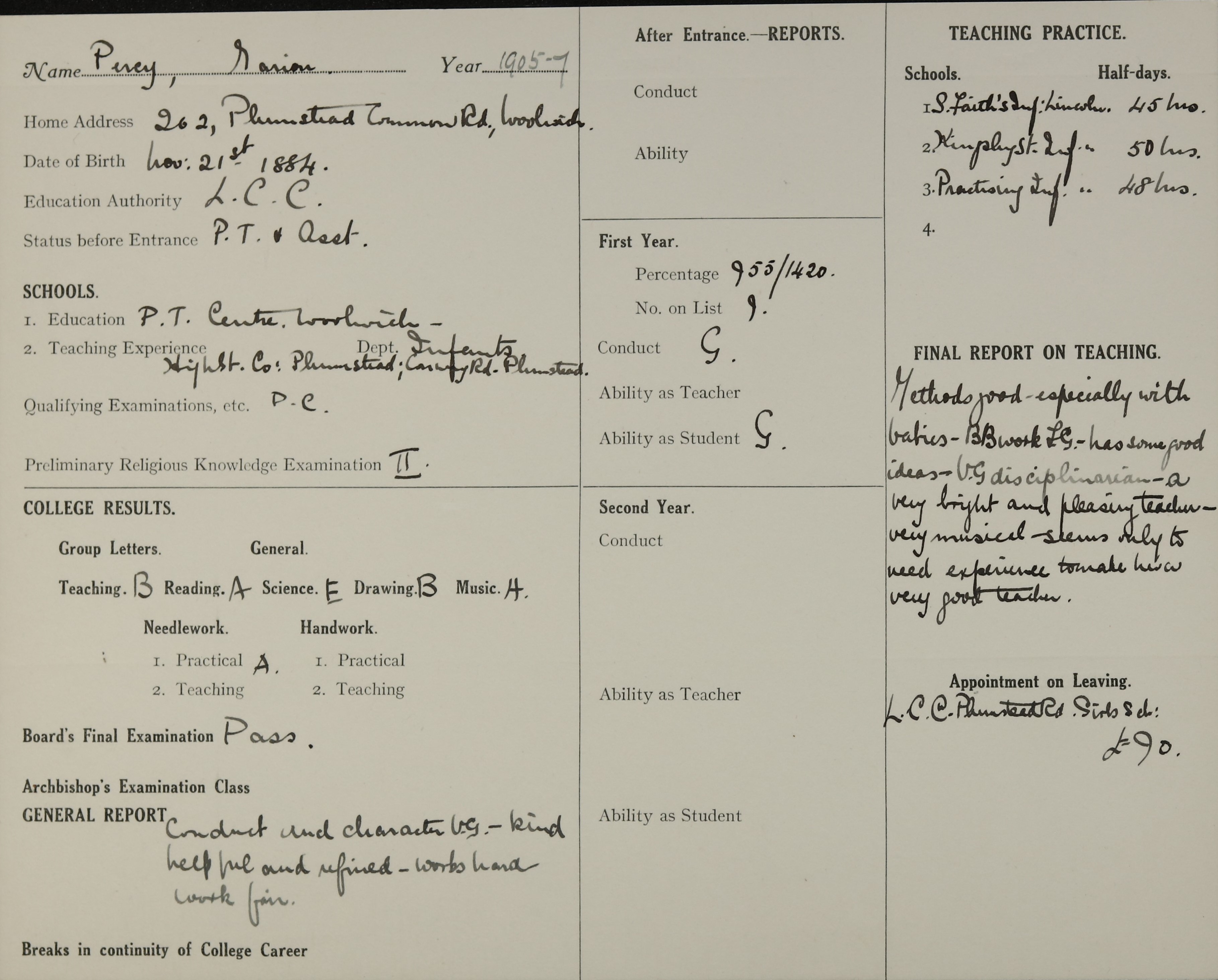 She is at 9 Acacia Parade, Plumstead. Her mother is an unlisted widow. Her brother, Malcolm, is listed as ‘Civil Service Clerk’. Marion and her sister, Agnes, is listed as ‘Pupil Teacher London School Board’.