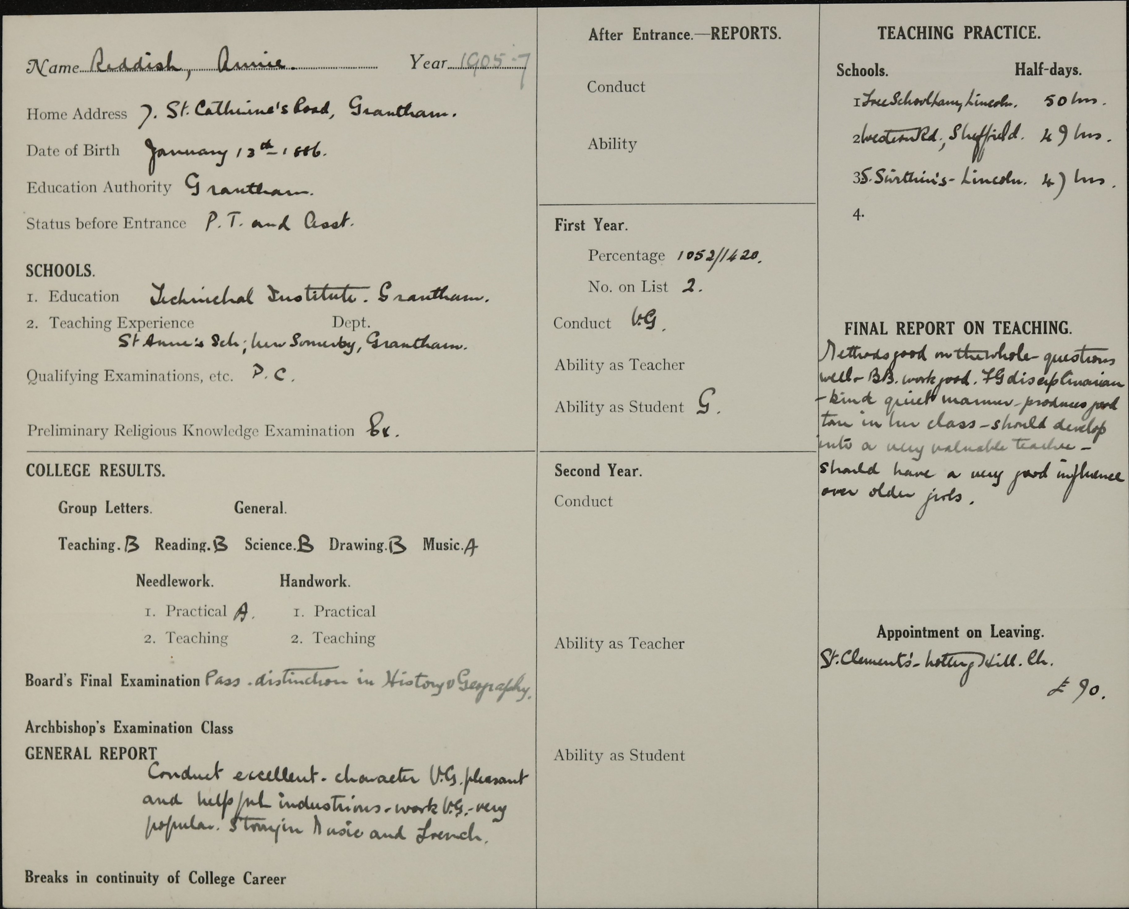 She is at 7 St. Catherines Road, Grantham. Her father is listed as ‘Commission Agent (Turf)’. Annie, her mother and siblings (Mary, Alice, Lizzie, Lottie, Edith, Arthur, Minnie and William) are unlisted.