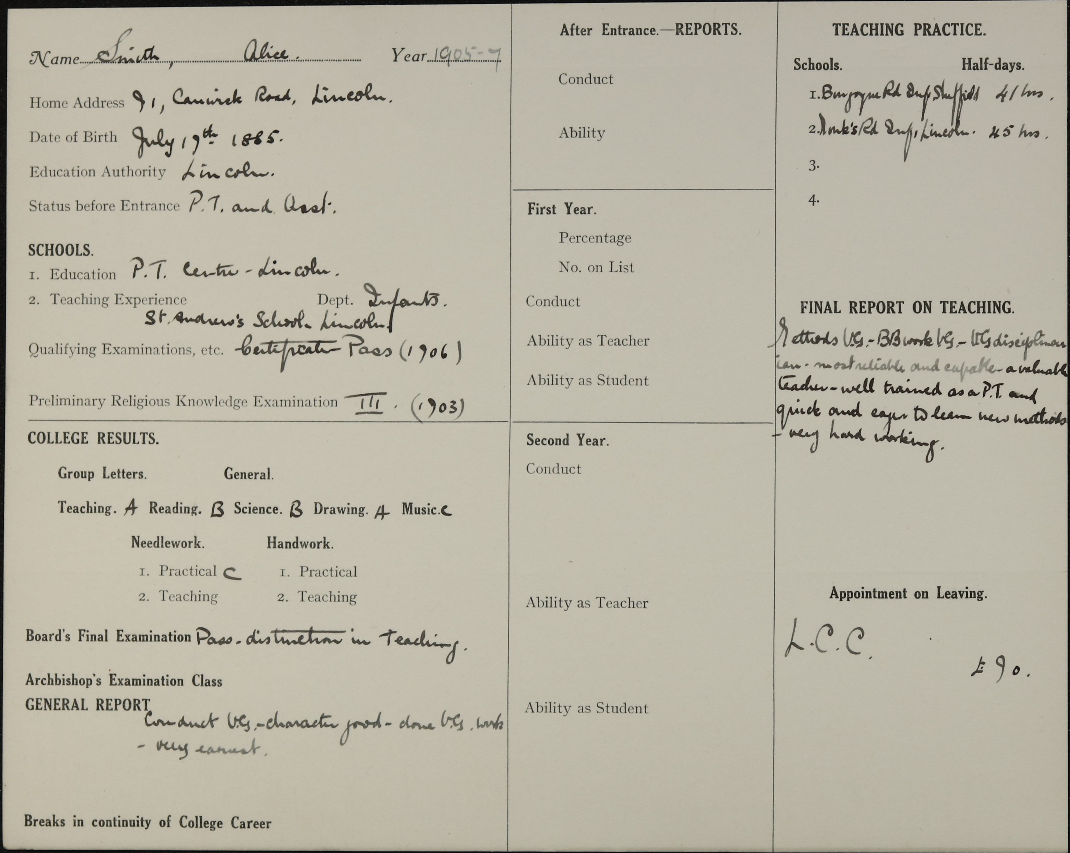 She is at 13 Charles Street, Lincoln. Her father is listed as ‘Foundry Engine Driver’. Alice is listed as ‘Pupil Teacher’. Her mother and sister, Ethel, are unlisted.