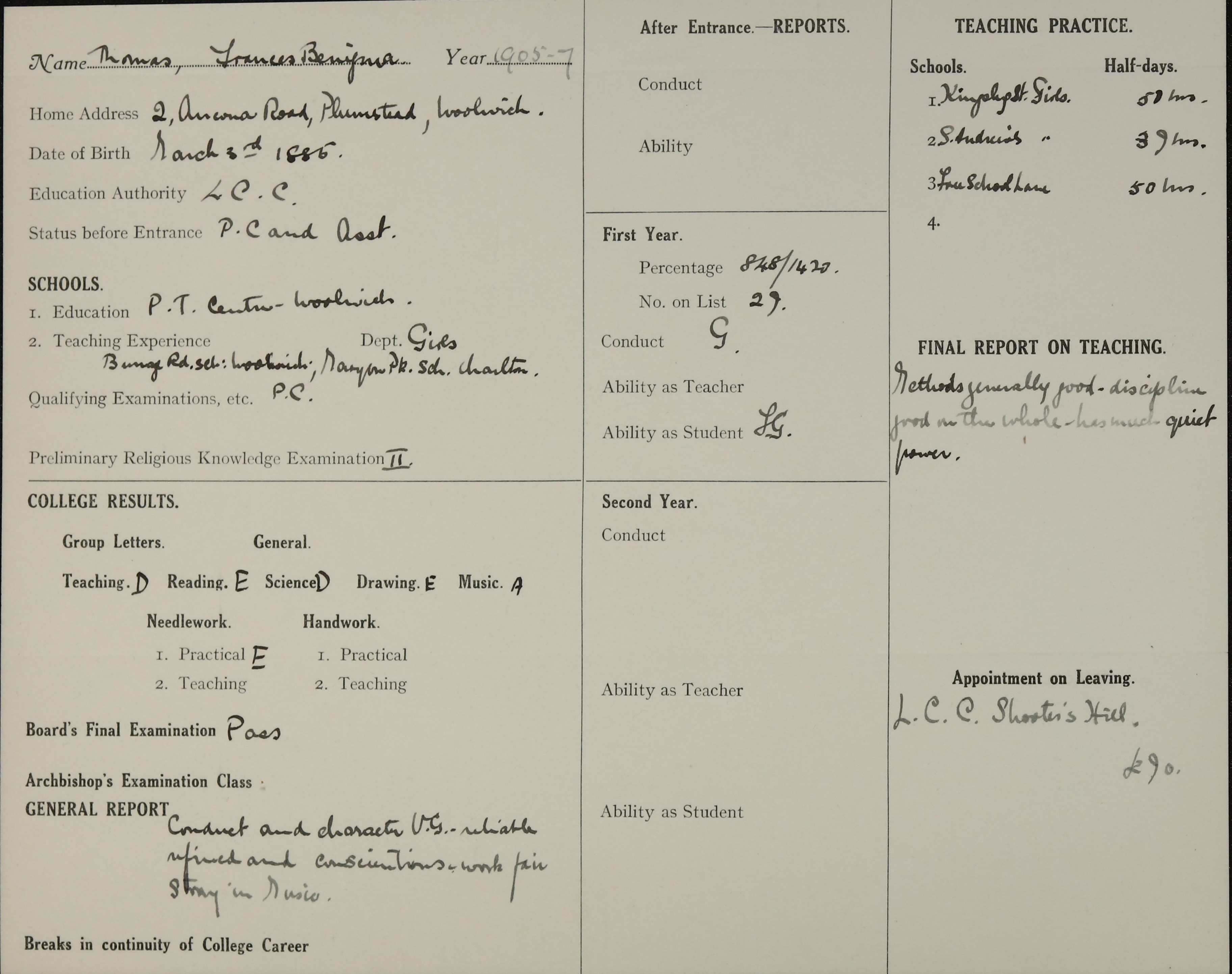 She is at 2 Ancona Road, Plumstead, London. Her father is listed as ‘Engine Fitter’. Her mother is unlisted. Frances is listed as ‘School Teacher’. Her brother, William, is listed as ‘Student’.
