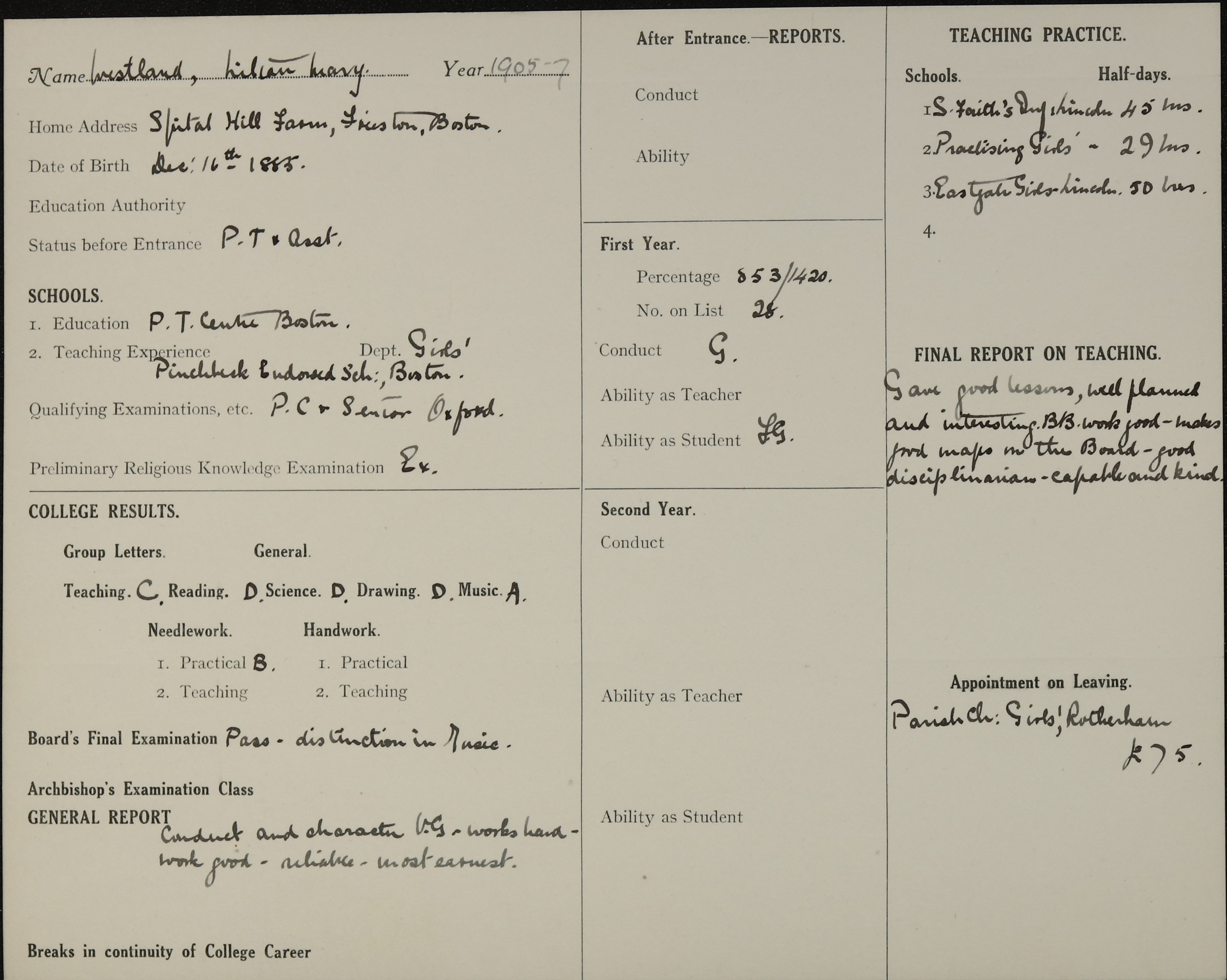 Appointed to Parish Church Girls’ Sch., Rotherham. £75.