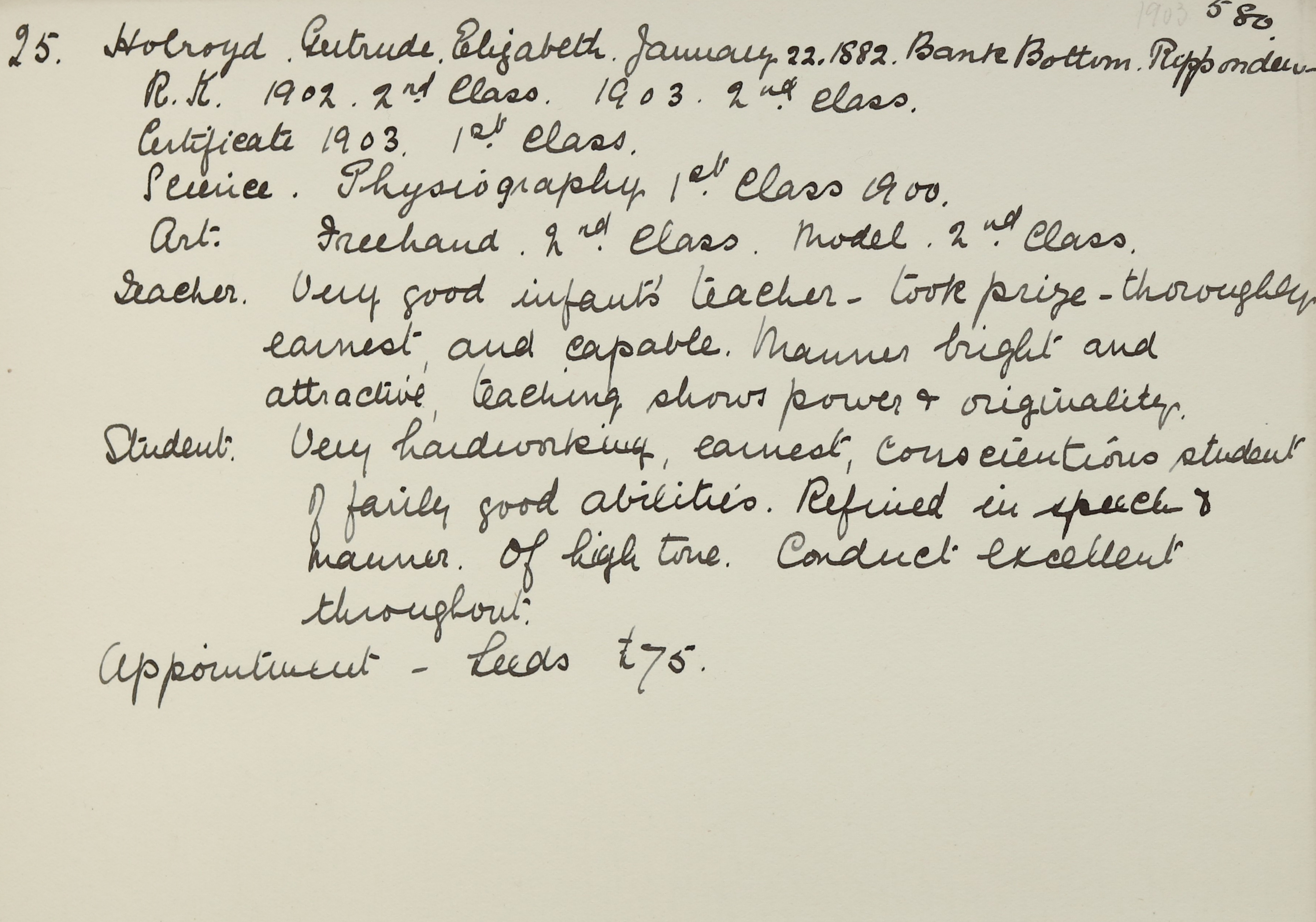 She is at New York, Ripponden, Yorkshire. Her father is listed as widowed and ‘Retired Farmer and Butcher’. Her sister, Mary, is unlisted. Amy and Gertrude are listed as ‘Schoolmistress’.