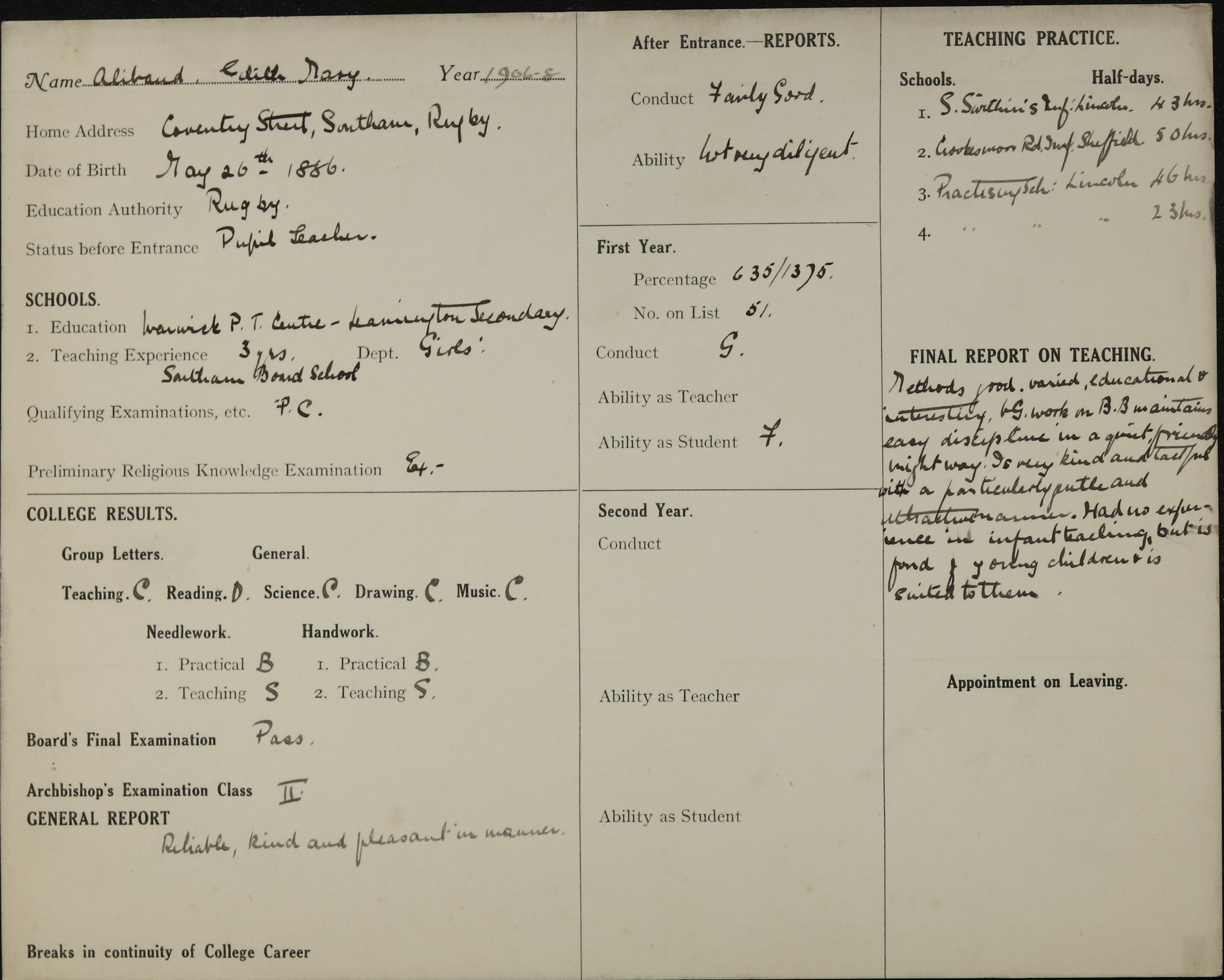 Born: 26 May 1886, Southam