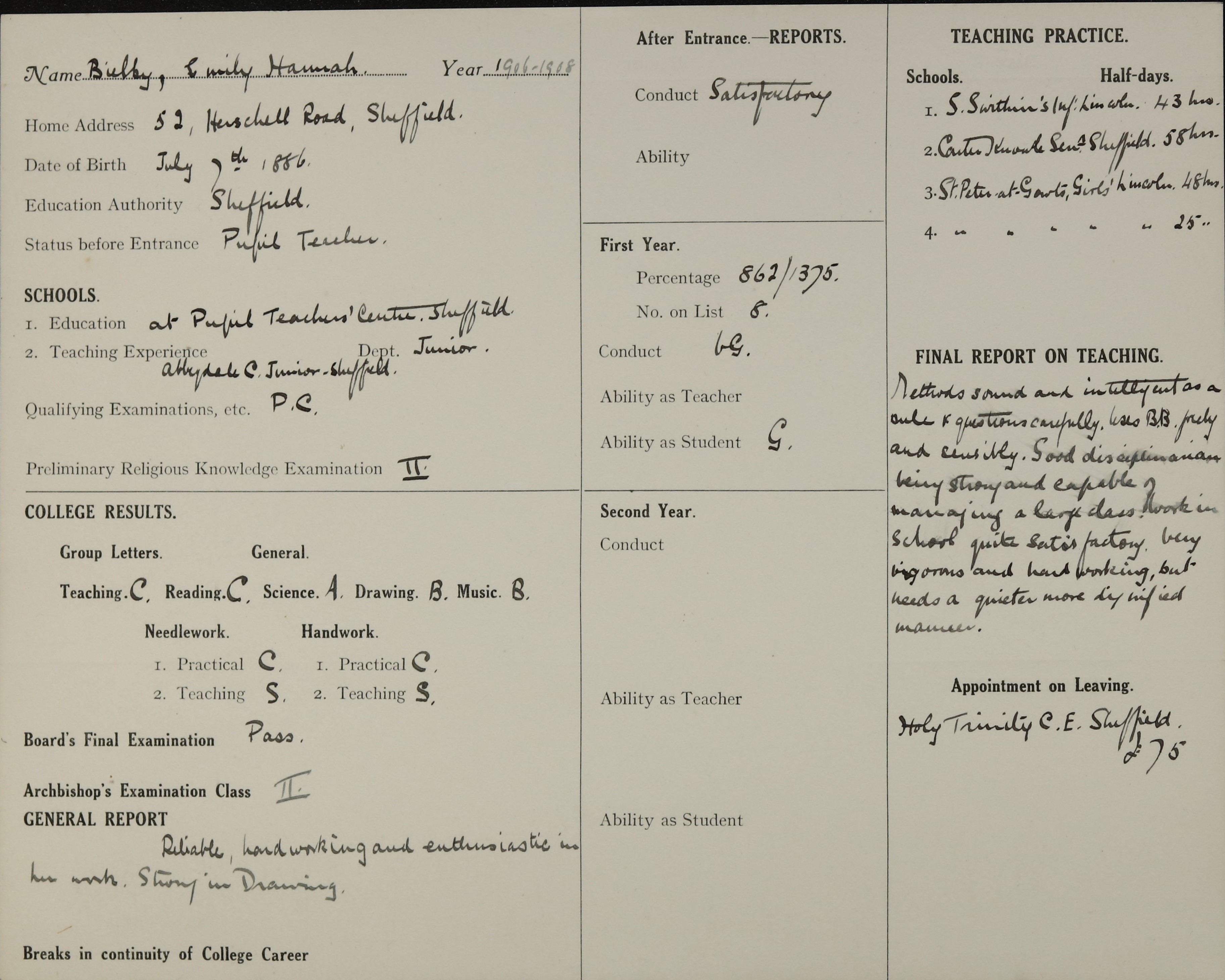 Appointed to Holy Trinity C. E. Girls', Sheffield. £75.