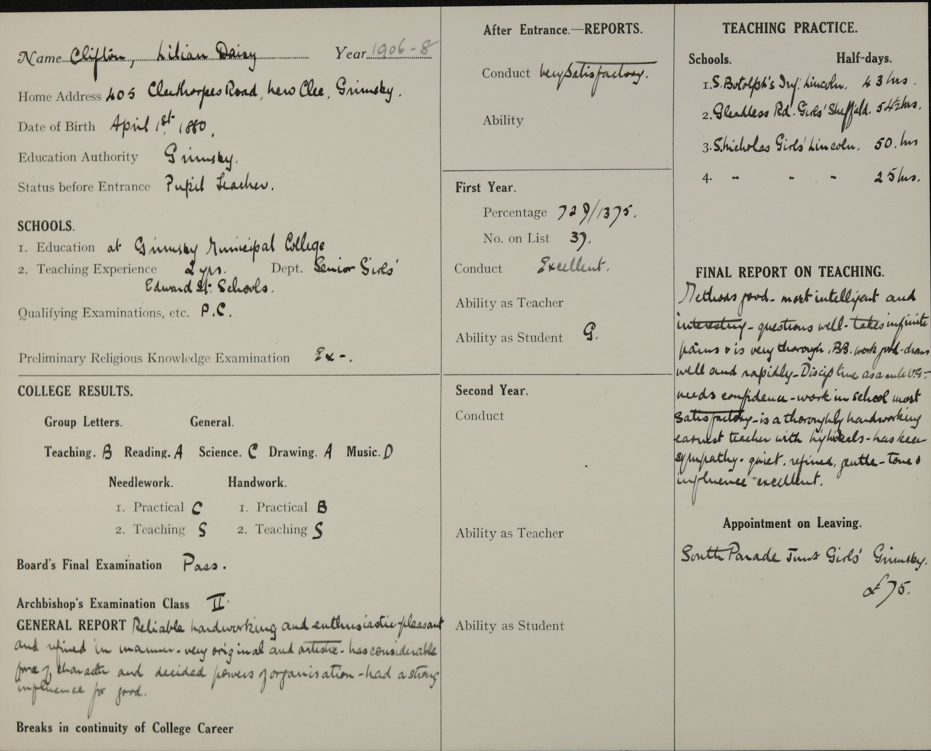 Sisters: Frances M Clifton (b. 1871), Florence Clifton (b. 1873), Nellie Clifton (b. 1875), Gertrude Mary Clifton (b. 1882) [LDTC 1908], Elsie Grace Clifton (b. 1885) [LDTC 1908], Constance Eliza Clifton (b. 1888)