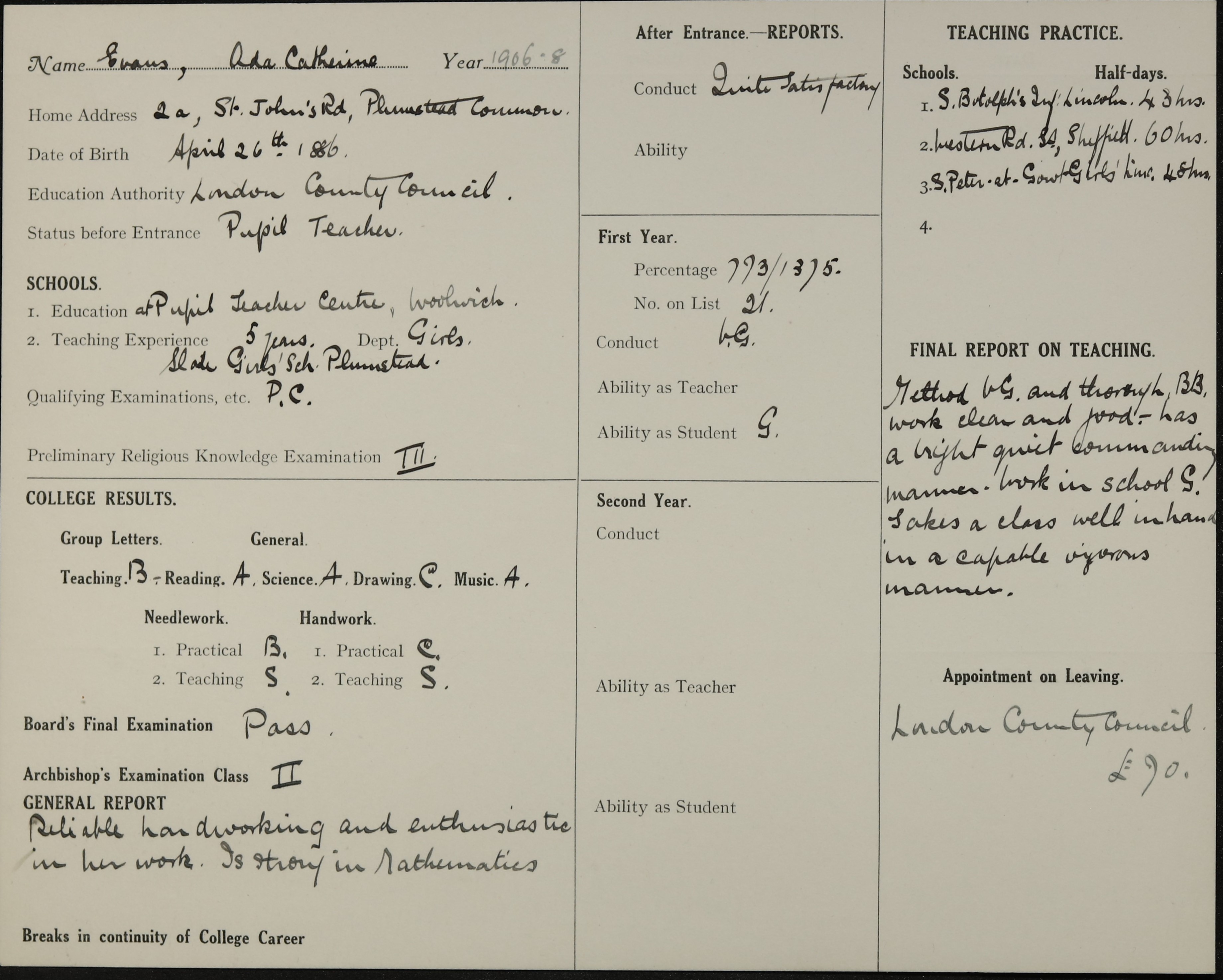 Appointed to L.C.C. 'The Timbercroft' School, Plumstead. £90.