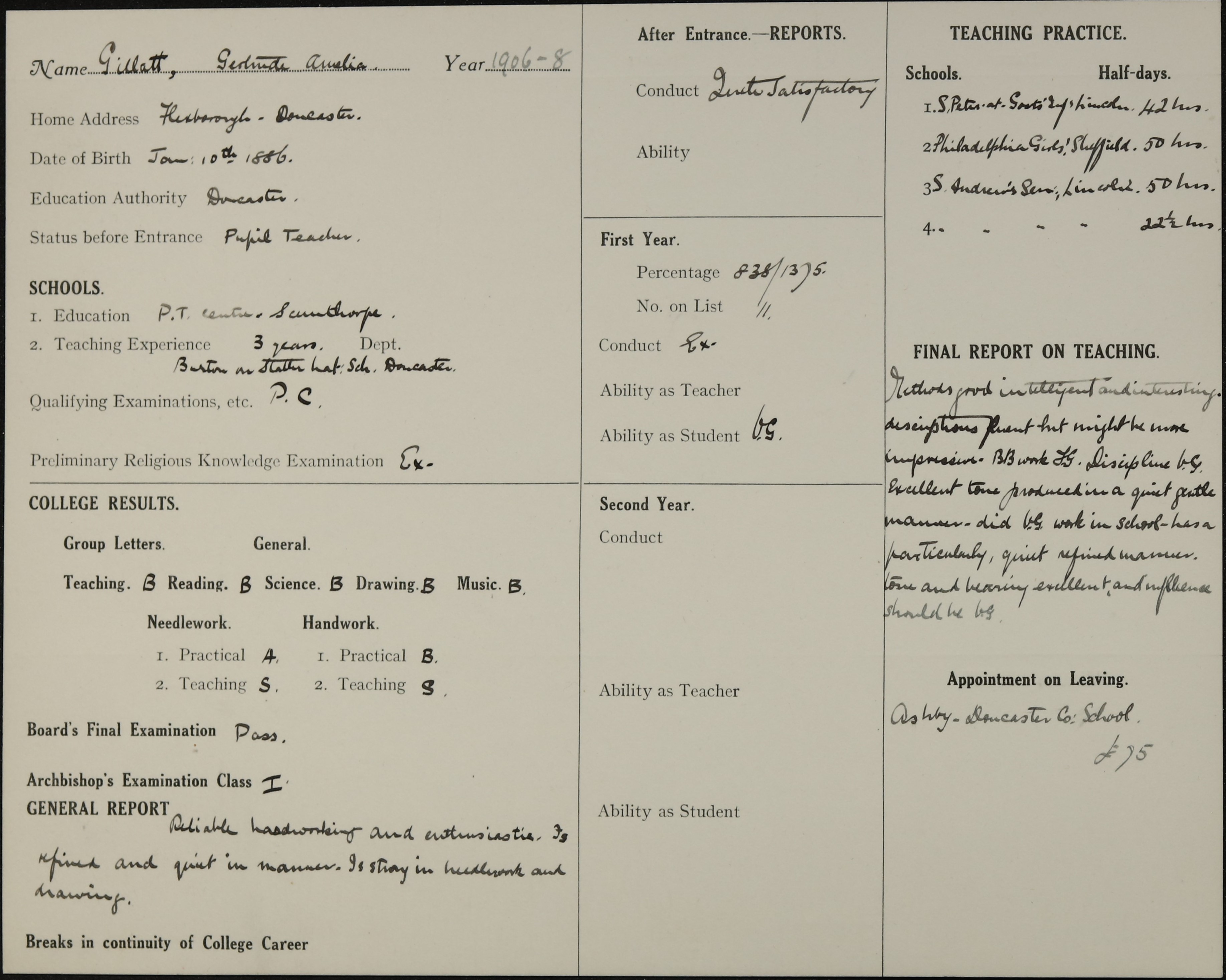 Appointed to Ashby Council School, Doncaster. £75.
