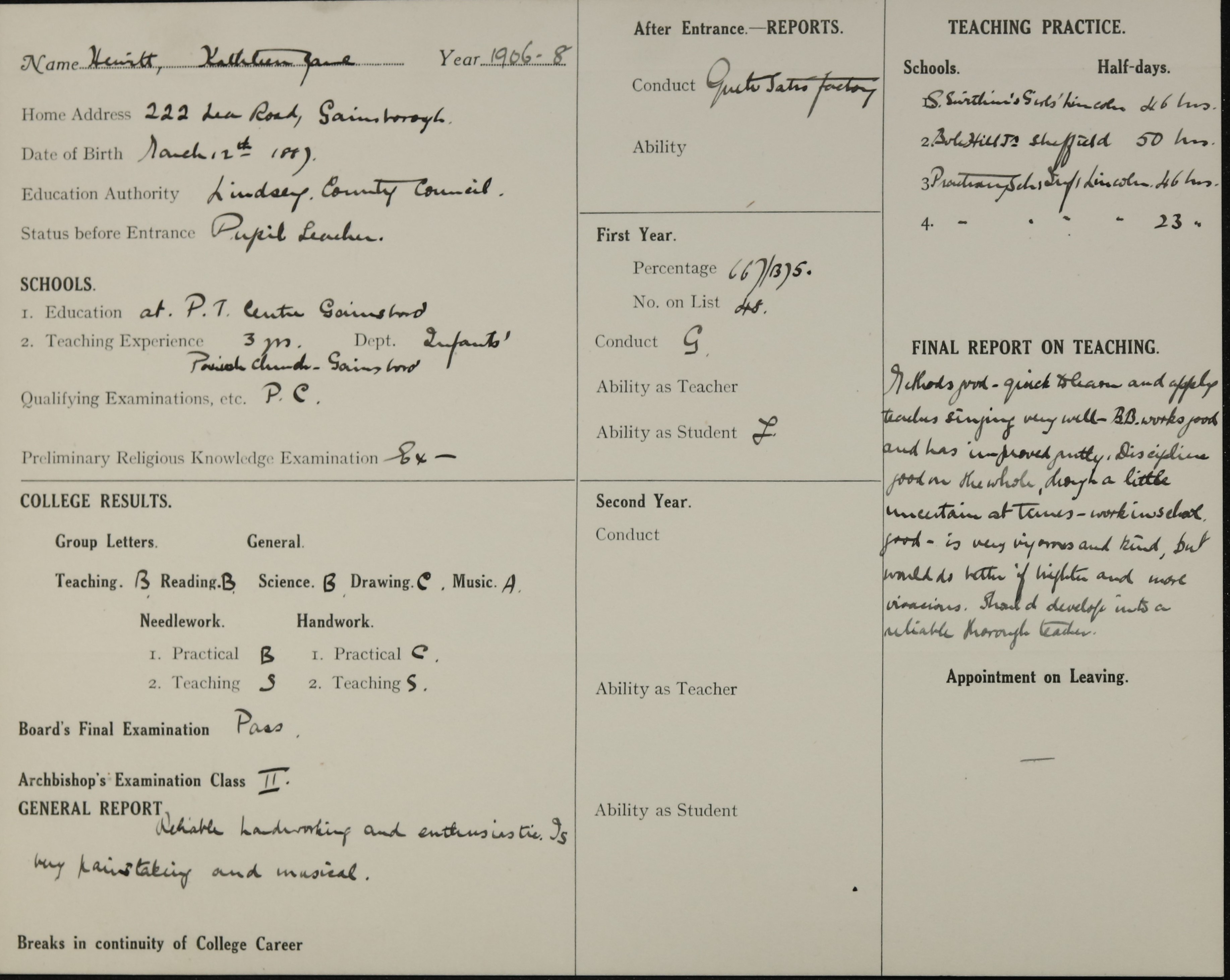 She is at 222 Lea Road, Gainsborough. Her father is listed as ‘Farmer’. Her brother, Oswald, is listed as ‘Farmer’s Son Working on Farm’. Her mother and sister, Frances, are unlisted. There is a Farm Labourer, John Geary (b. 1842). Kathleen is listed as ‘Teacher Elementary School’.
