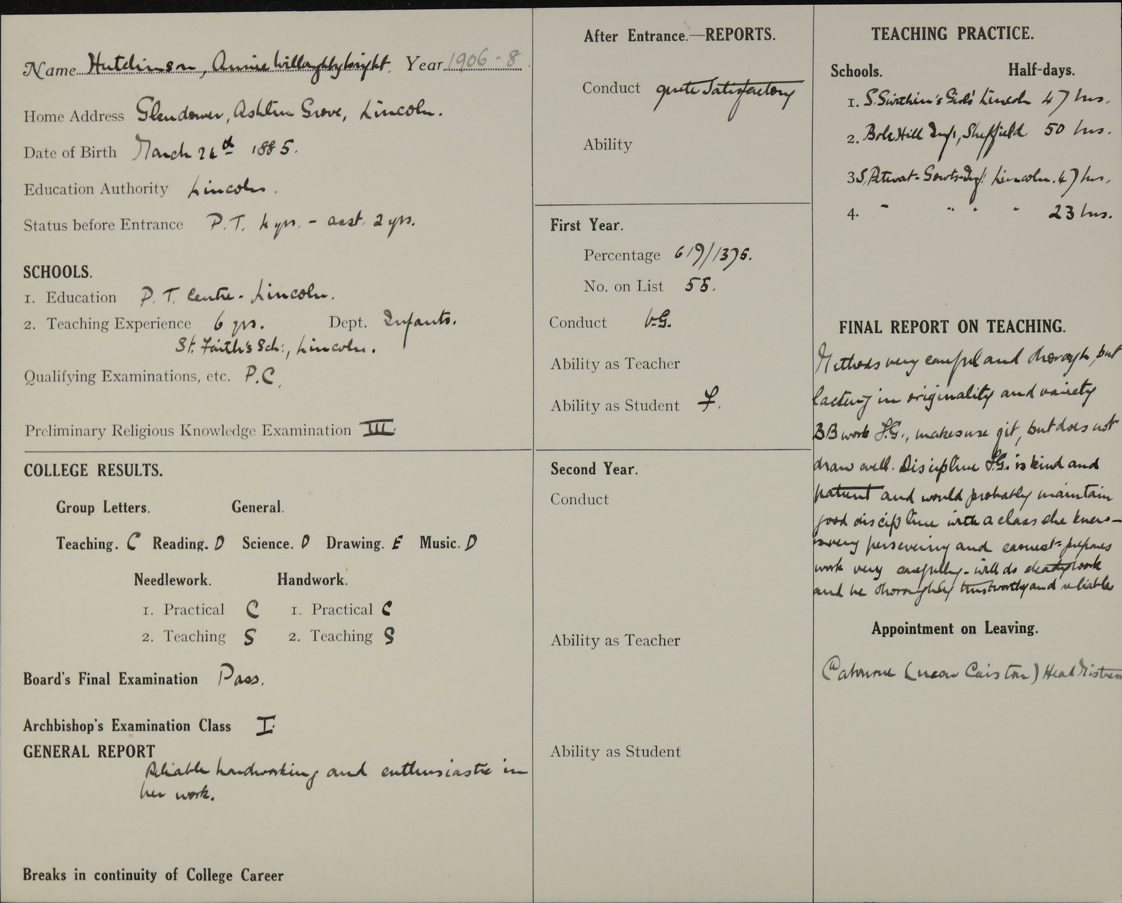 HUTCHINSON, Annie Willoughby Wright of 44 Mount Street, Lincoln, spinster died 16 January 1962 at The Lawn Hospital, Lincoln. Probate Lincoln 16 March to Henry Willoughby Hutchinson, retired engineer. Effects £1350, 13s.