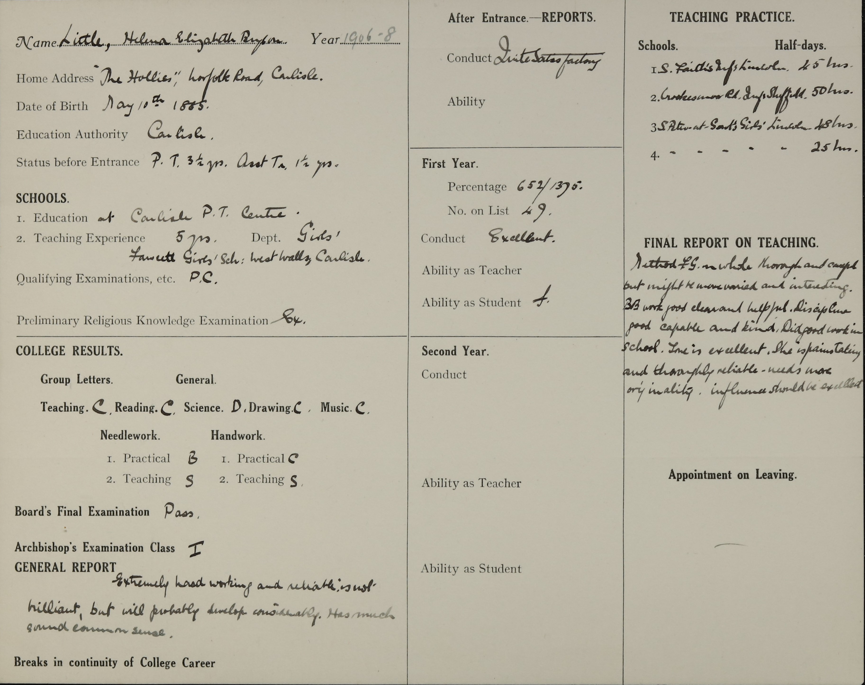 She is at 7 Ghyll Side, Kendal as a boarder. The head of the household, Arthur Whiteley (b. 1884), is listed as ‘Fitter’. Helena is listed as a boarder and ‘Elementary School Teacher Head’. Mary Nelson (b. 1893) is listed as ‘Elementary School Teacher Assistant’.