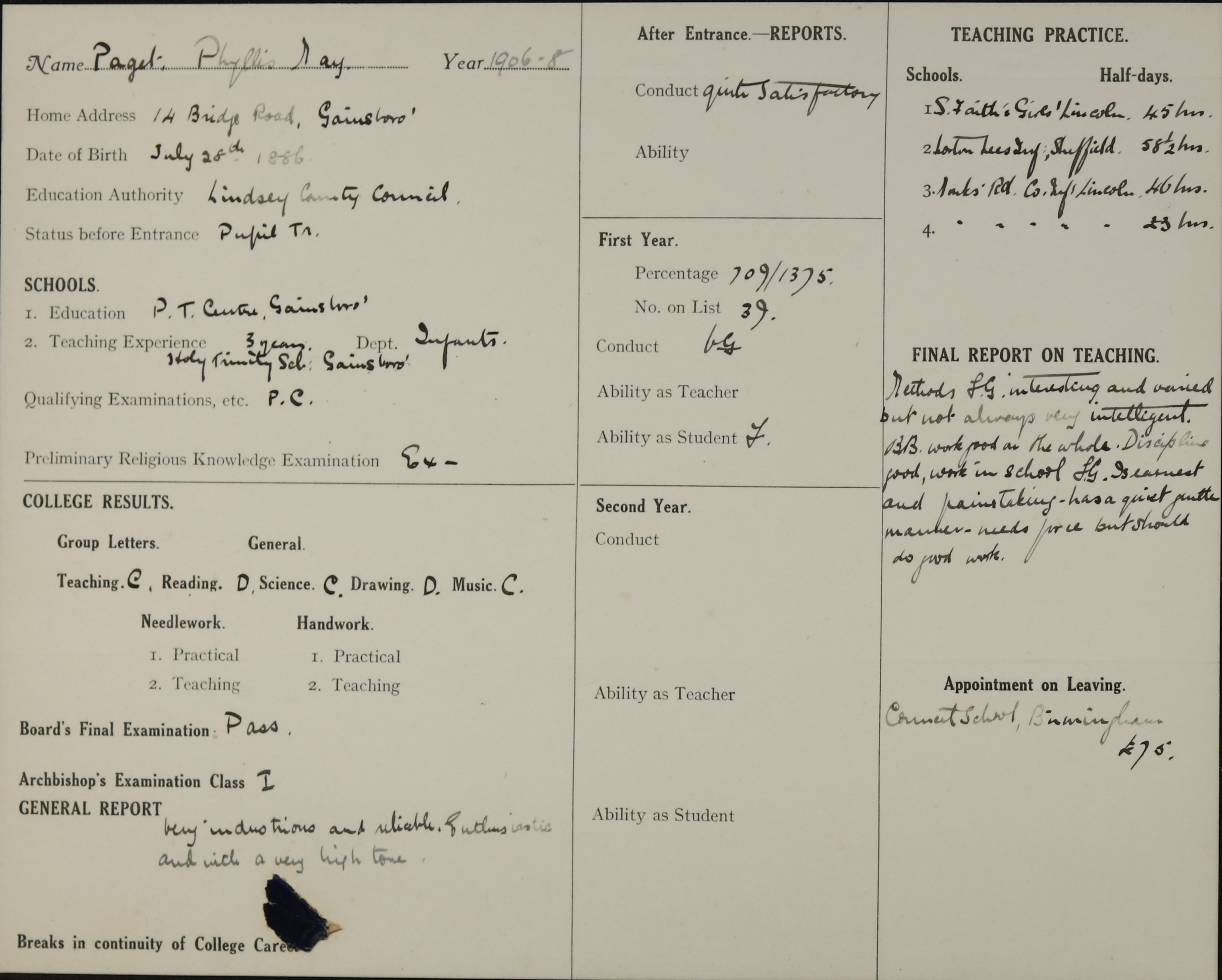 She is at 20 Hotspur Road, Gainsborough. Her father is listed as ‘Secretary Accountant’. Her mother is unlisted. Phyllis is listed as ‘Assistant School Mistress Elementary’.