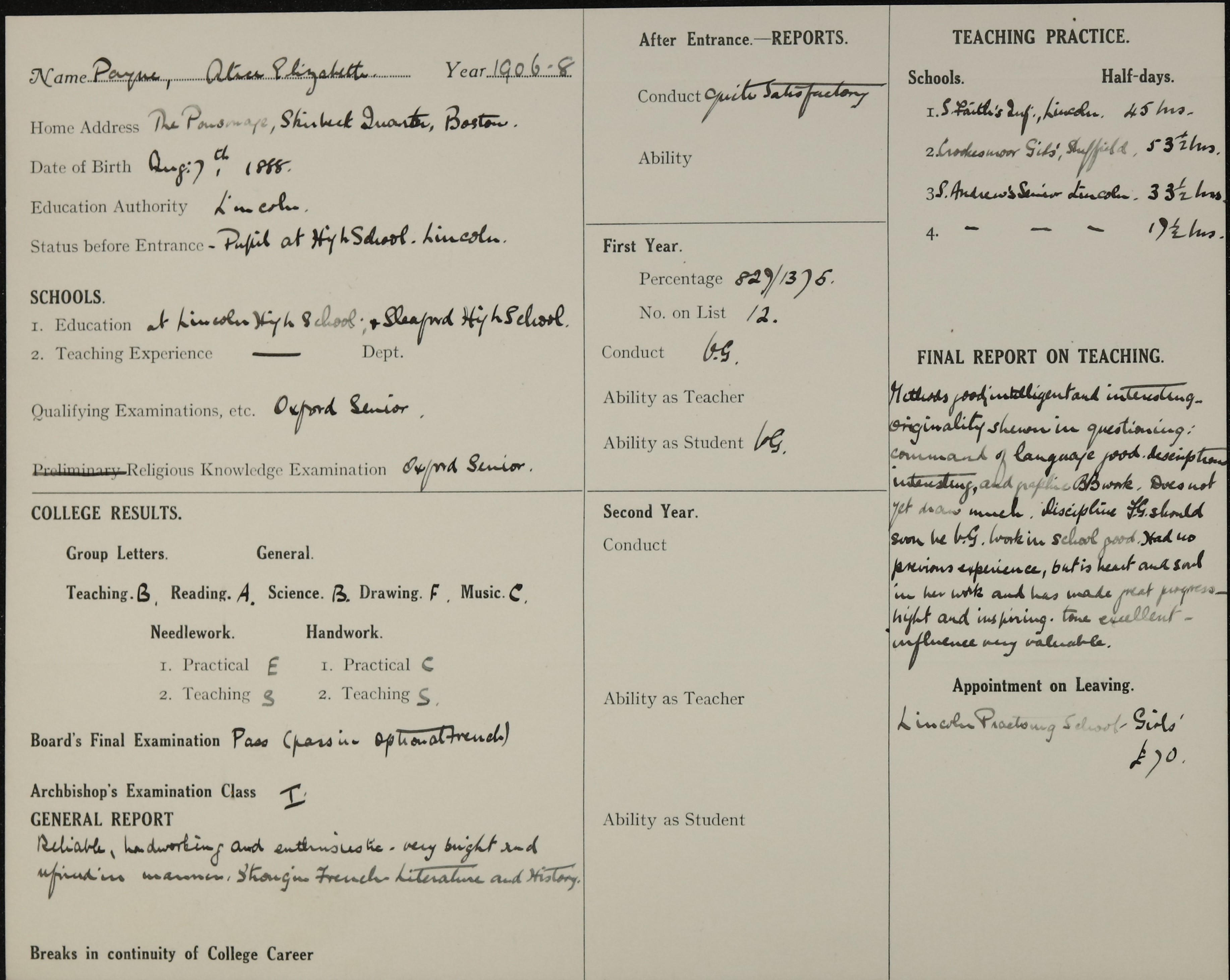 She is at Lower Avenue, Lincoln. Her father is listed as ‘Clerk in Holy Orders’. Her brother, John, is listed as ‘Student University’. Alice, her mother and siblings (Helen, Agnes and Richard) are unlisted. Rebecca Edith Payne (b. 1875) and Kena Payne (b. 1899) are unlisted visitors. There is a servant, Kate Barrick (b. 1897).