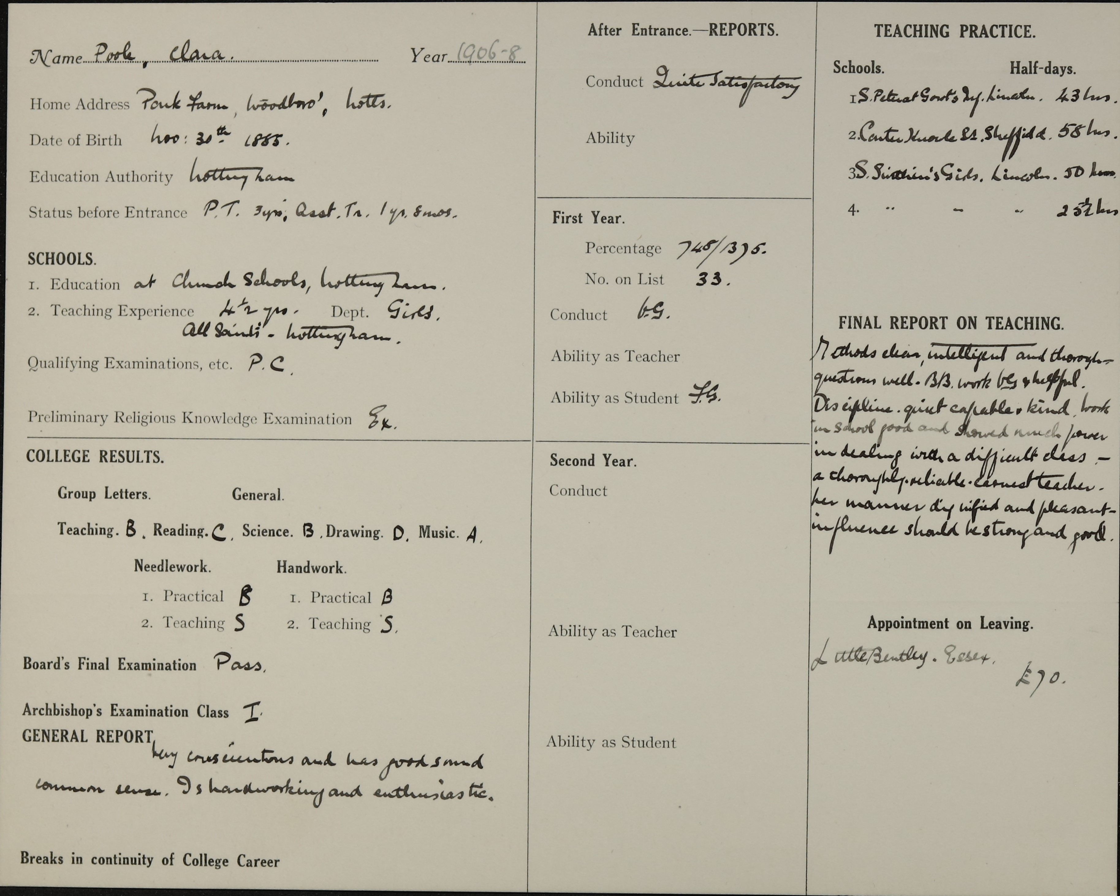 She is at 107 Borett Road, Nottingham. Her mother is unlisted. Clara is listed as ‘School Teacher Elementary’.