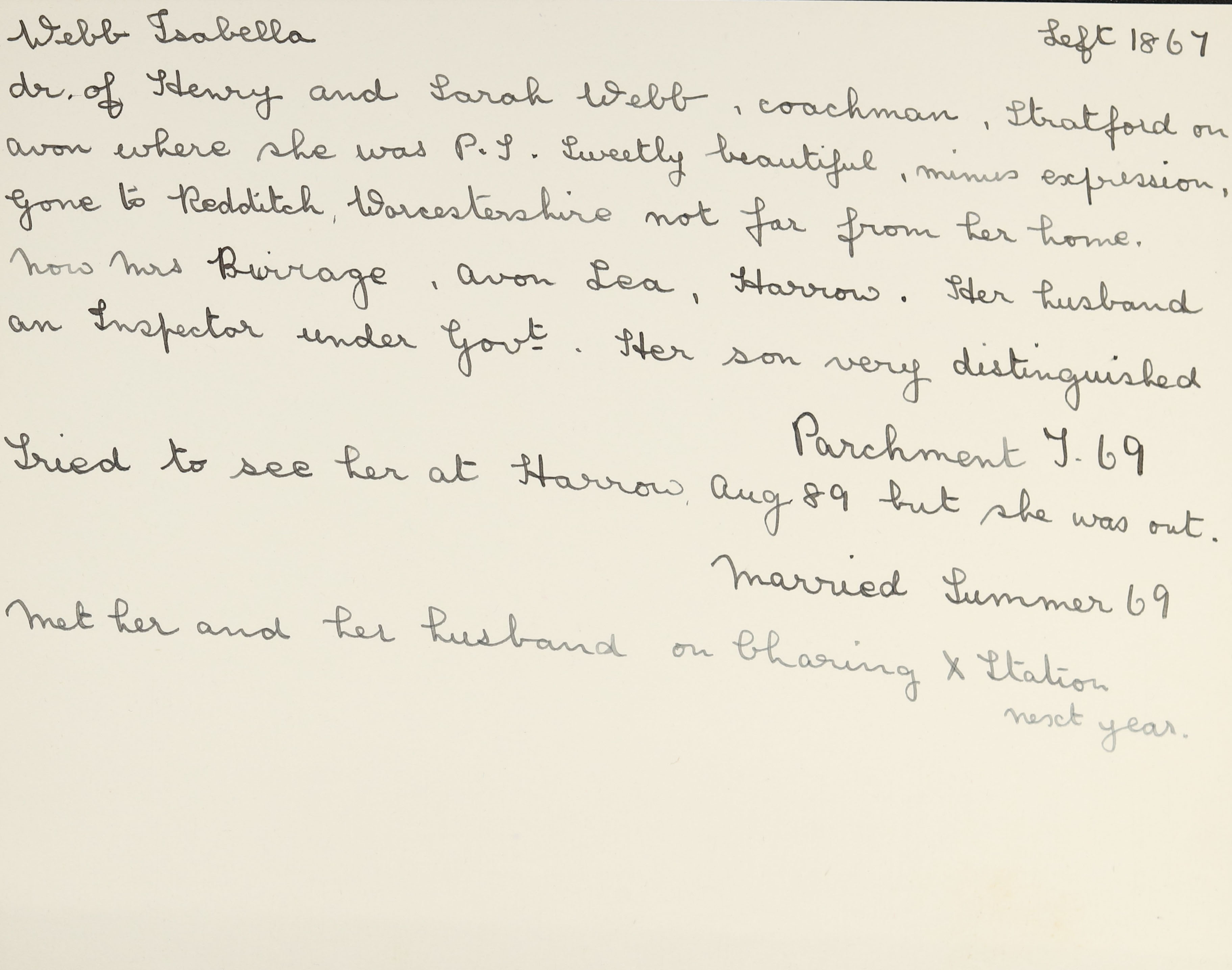 She is at Peterborough Road, Harrow. Her husband is listed as ‘Inspector of Schools’. Isabella and her children (Isabel and Cyril) are unlisted. There is a servant, Sarah A Monger (b. 1872).