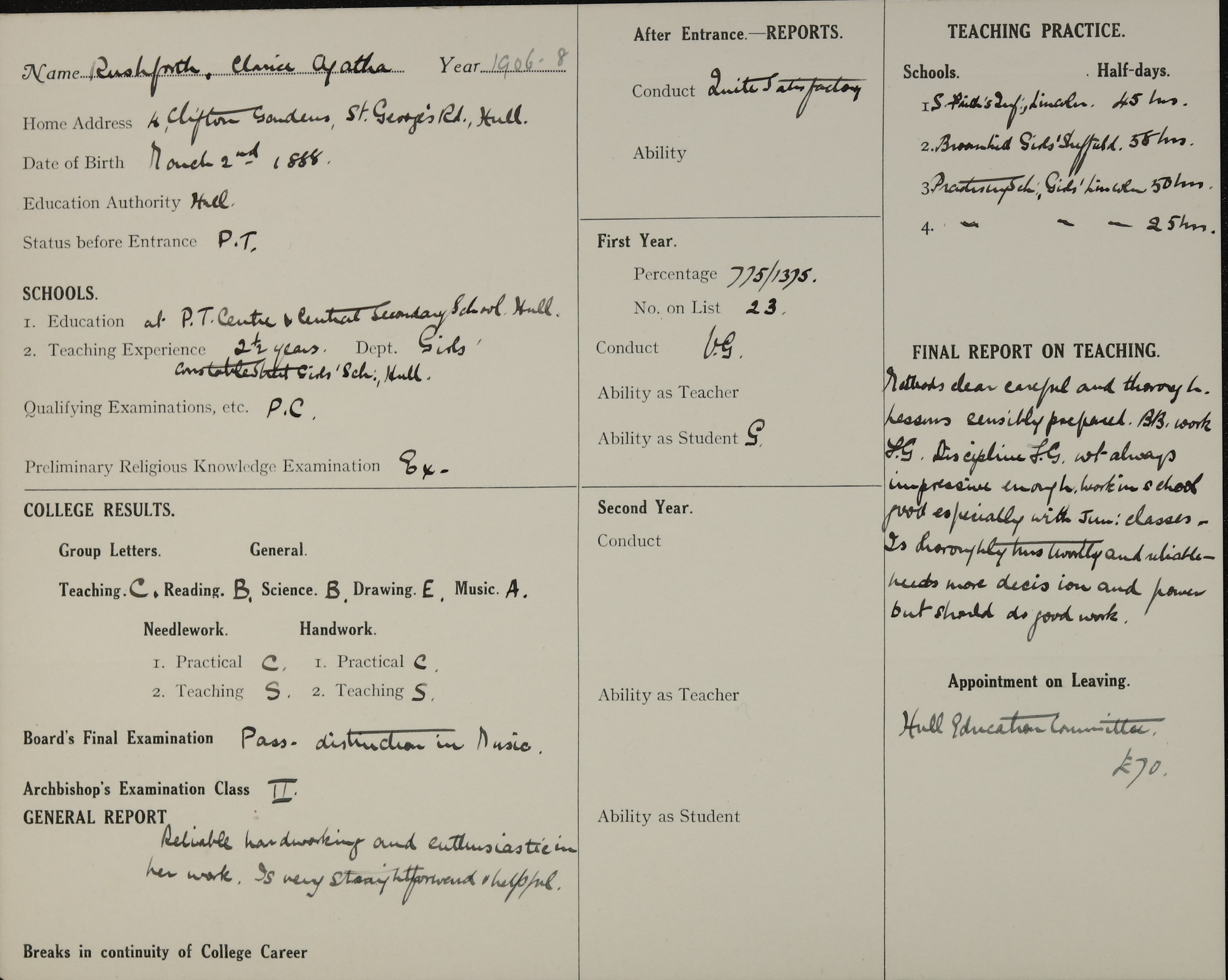 She is at 4 Clifton Gardens, Hull. Her father is listed as ‘Engine Fitter’. Her stepmother is unlisted. Clarice is listed as ‘Elementary School Teacher’.