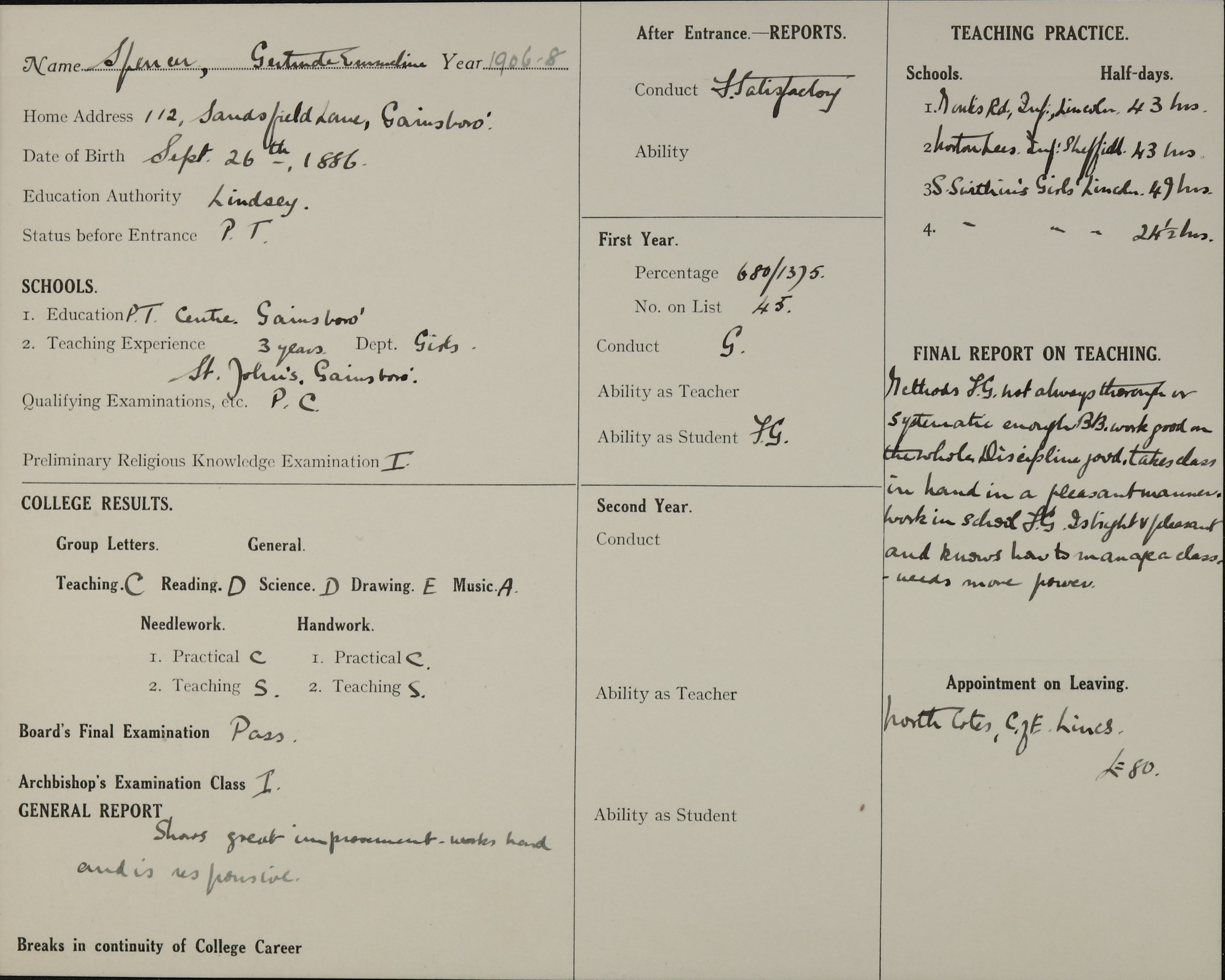 She is at 112 Sandsfield Lane, Gainsborough. Her father is listed as ‘Iron Turner in Tool Shop’. Her mother is unlisted. Her brother, William, is listed as ‘Tool Fitter (Apprentice)’. Gertrude is listed as ‘Monitress Elementary School’.