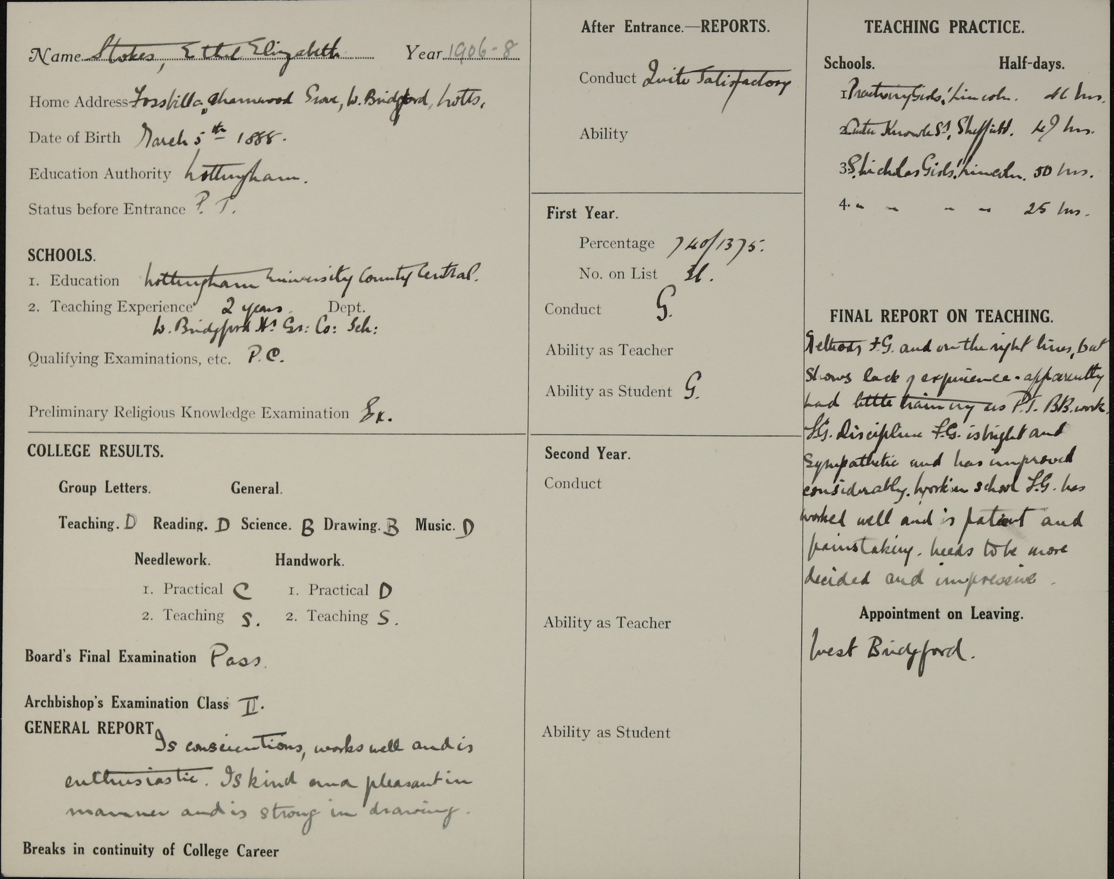 She is at Charnwood Grove, West Bridgford, Nottinghamshire. Her father is listed as ‘Lace Dyer and Dresser’. Elizabeth, her mother and siblings (Lilian, Will and Gertrude) are unlisted. Her aunt, Sarah A Stokes (b. 1877), is listed as ‘School Teacher’. There is a servant, Mary M Page (b. 1872).