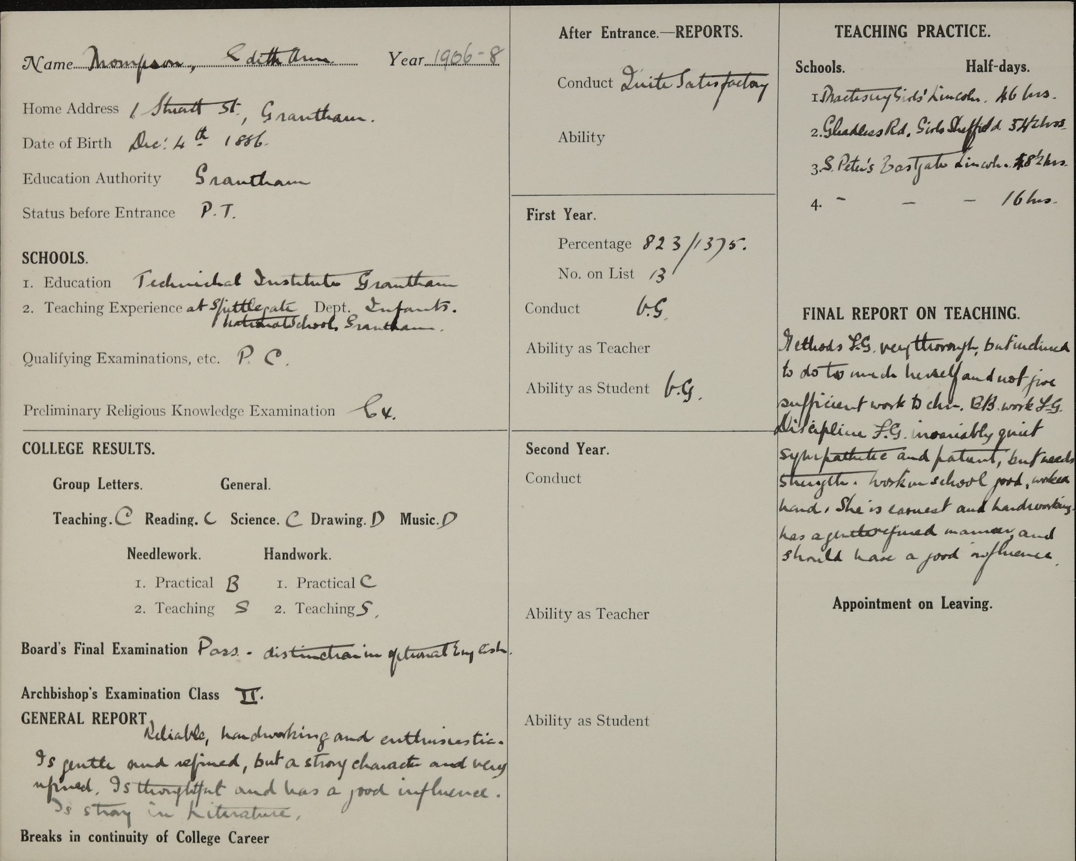 She is at 23 Dudley Road, Grantham. Her mother is a widow and listed as ‘Purveyor of Milk’. Her brother, Arthur, is listed as ‘Clerk Estimating’. Edith is listed as ‘Teacher Elementary School’.