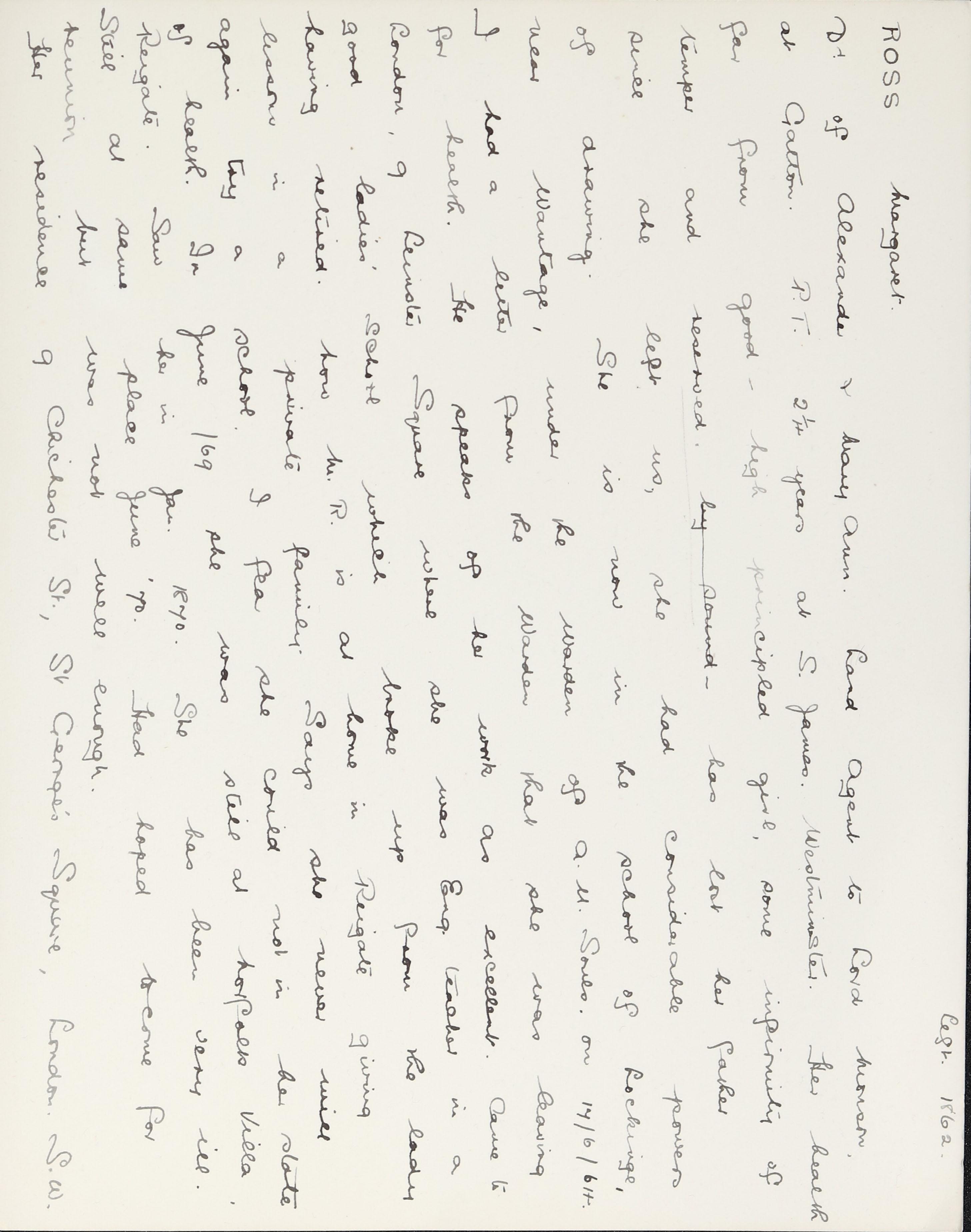 She is at London Road, Reigate. Her mother is listed as widow and ‘Annuitant’. Margaret and her sister, Mary, are listed as ‘Governess’. Her brother, Alexander, is listed as ‘Civil Engineer’. Edward Thurman (b. 1826) is listed as boarder and ‘Organist’. Helena Browning (b. 1859) and Harriett Reeves (b. 1859) are unlisted. There is a servant, Esther McDonald (b. 1845).