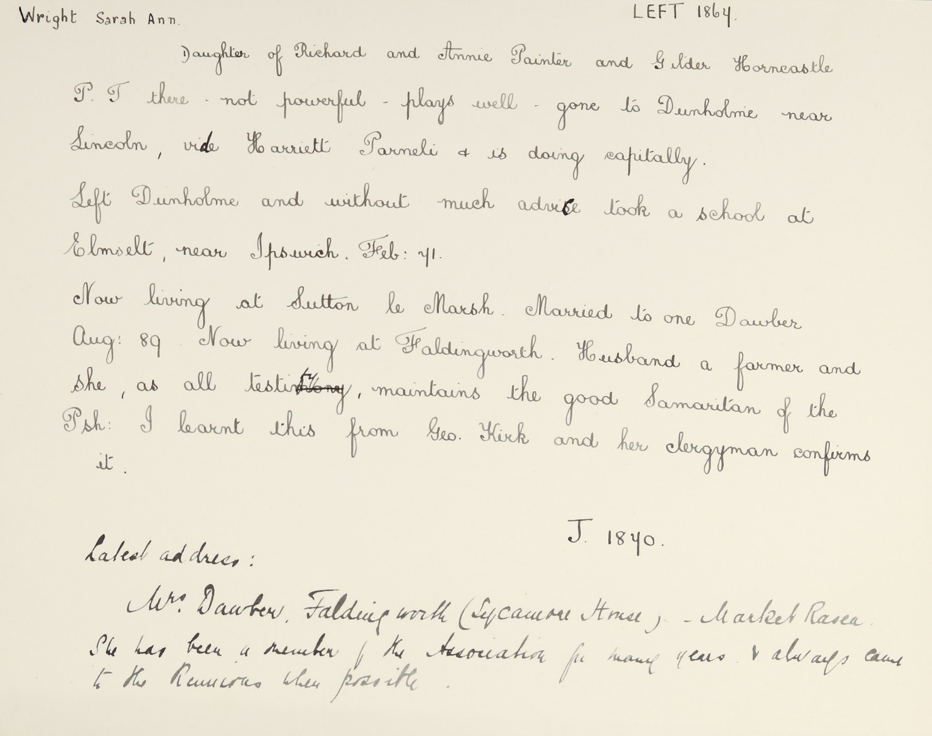 She is at East Street, Horcastle. Her father is listed as ‘Painter and Gilder Master Employing 2 Men’. Sarah, her mother and siblings (Joseph and Mary) are unlisted. Her uncle, Joseph Marsh (b. 1820), is listed as ‘Painter and Gilder’. There are 4 visitors: William Huckans (b. 1811), listed as ‘Engineer’, Mary A Huckans (b. 1812), William Huckans (b. 1842) and Mary A Huckans (b. 1851).