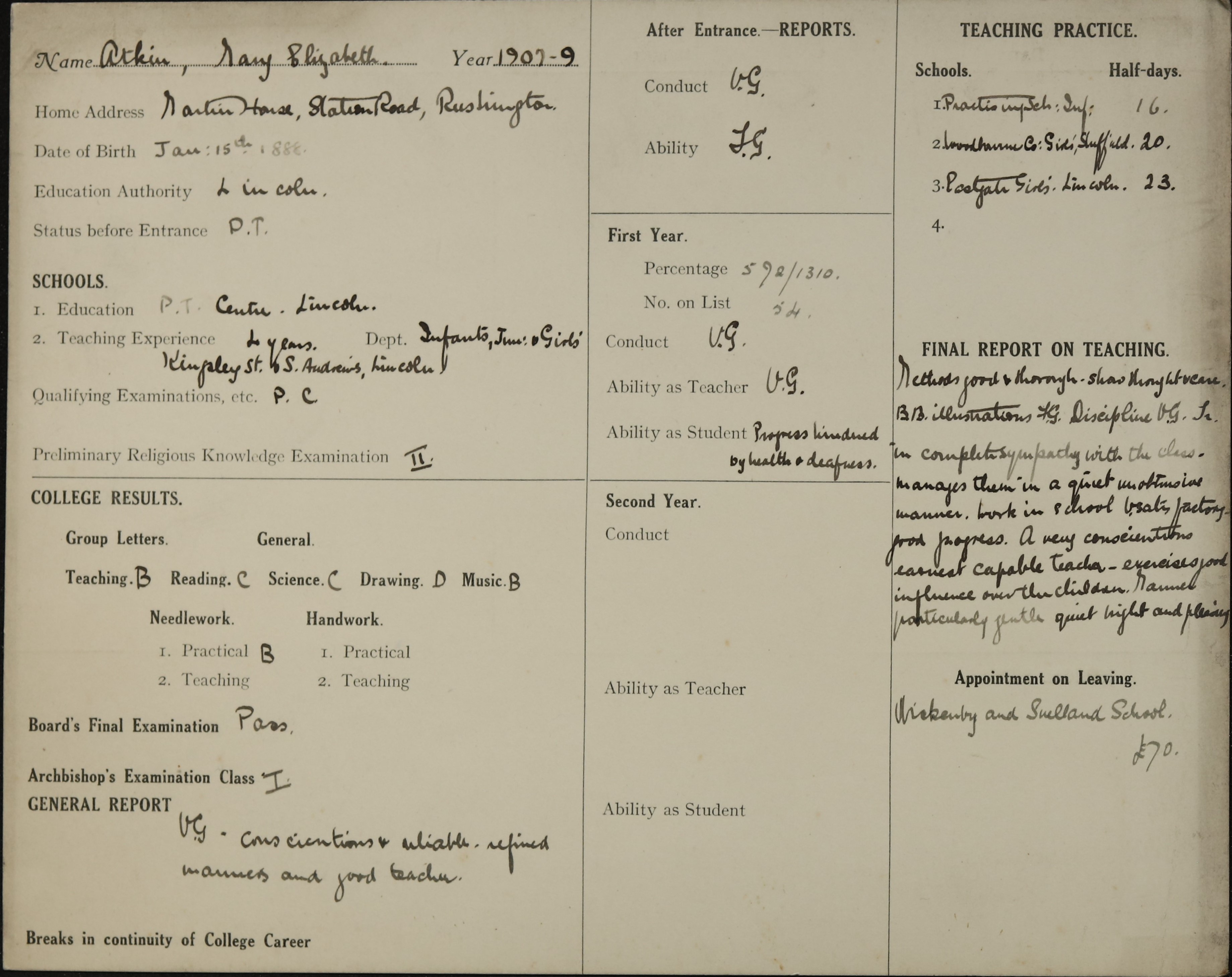 Appointed to Wickenby and Snelland School. £70.