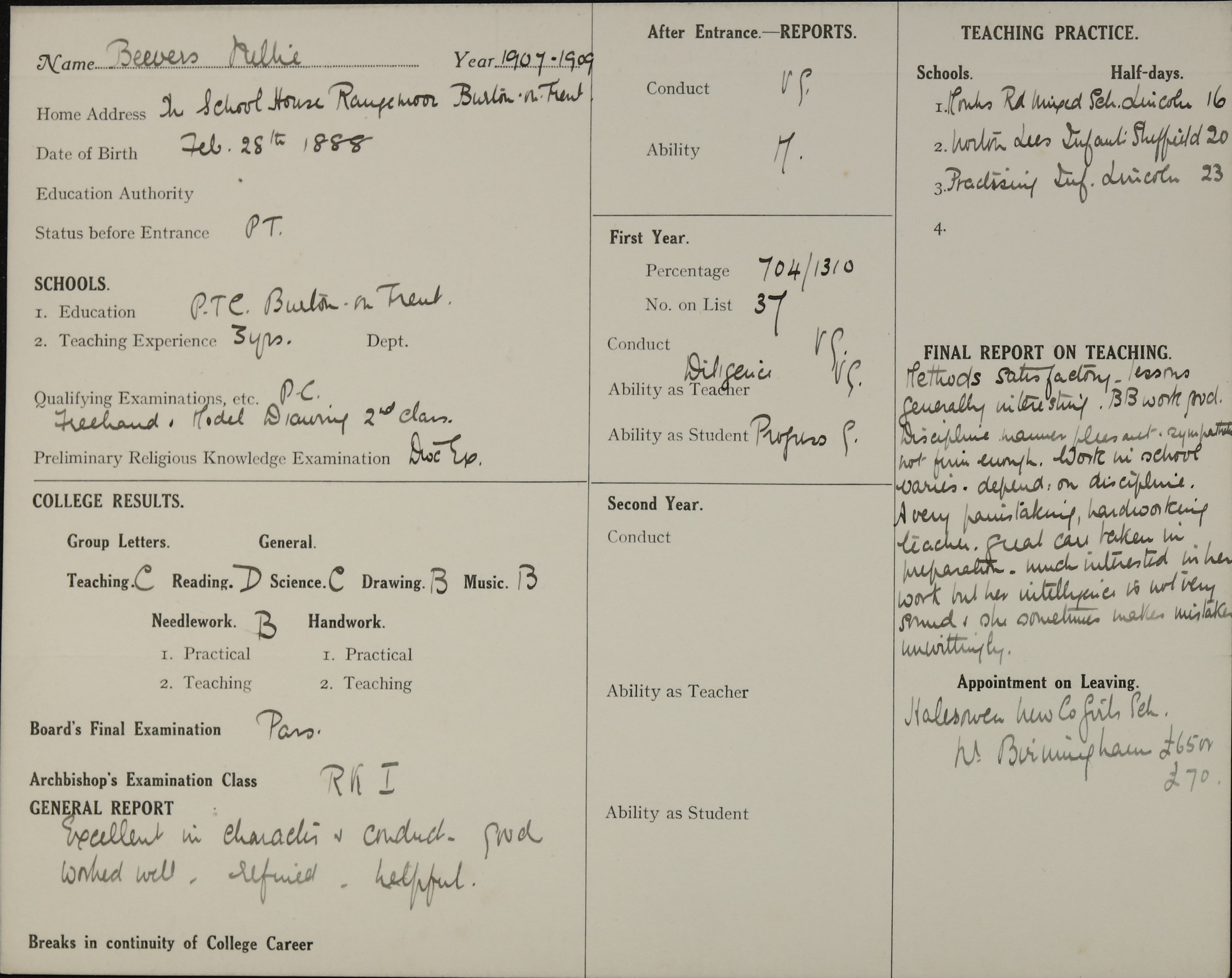 Appointed to Halesowen New Council School Girls' School, near Birmingham. £65 or £70.